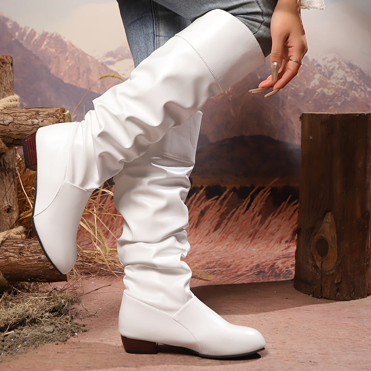 Women's Solid Color Chunky Heel Knee High Boots Slip-On Dress Shoes