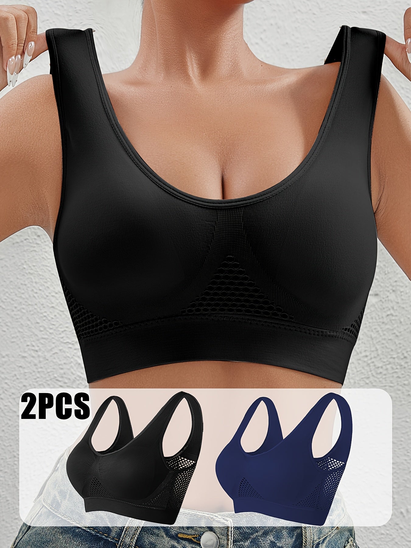 Women’s Sports Bras Breathable Mesh No Underwire Plus Size Black Blue 2pcs