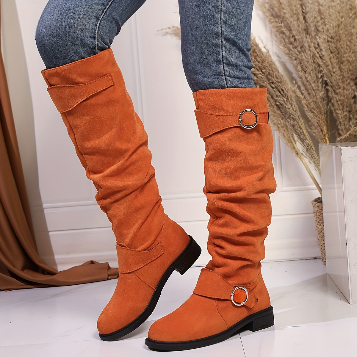Women's Velvet Knee-High Boots with Buckle, Solid Color, Low Heel