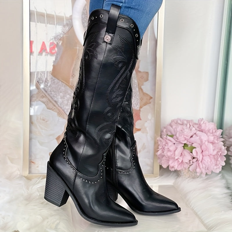 Women's Western Cowboy Boots Knee-High Embroidered Leather Dress Shoes