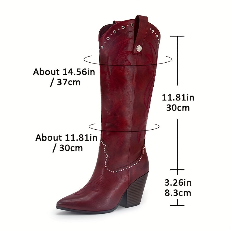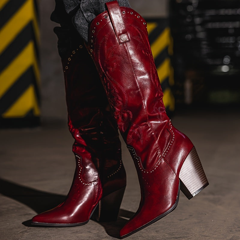 Women's Western Cowgirl Boots Red Faux Cover Knee-High Chunky Heel