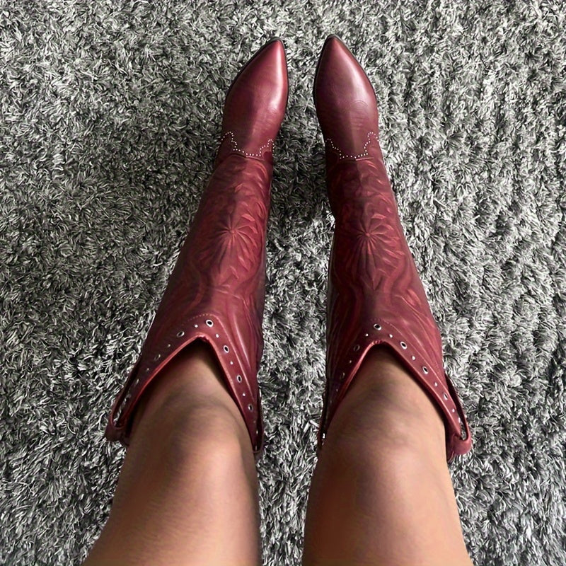 Women's Western Cowgirl Boots Red Knee-High Zipper Chunky Heel Pointed Toe