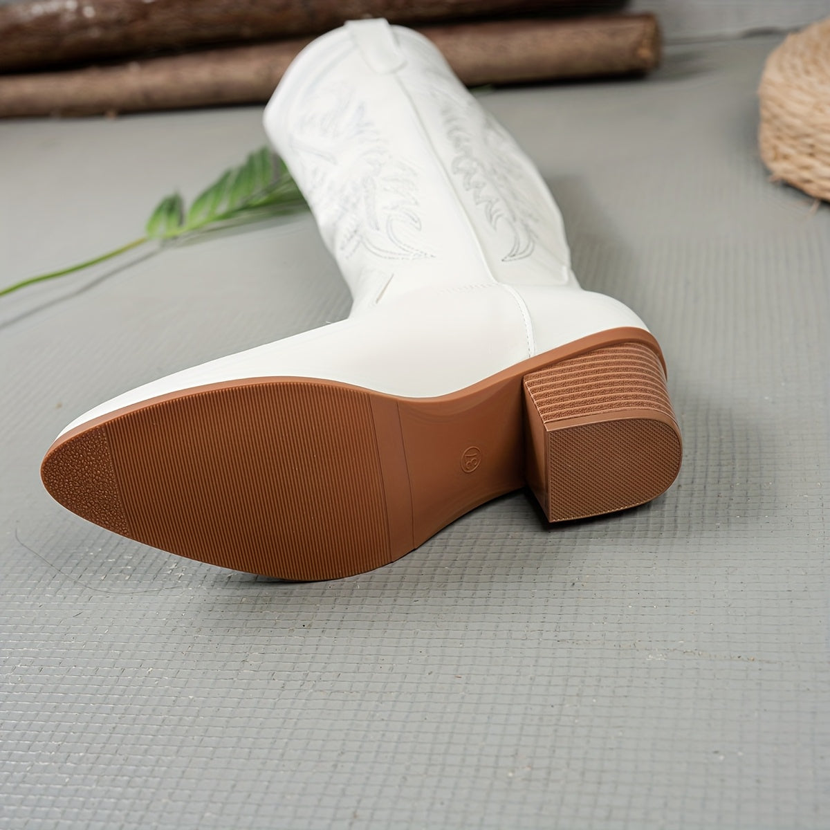 Women's White Embroidered Mid-Calf Cowboy Boots Slip-On Pointed Toe