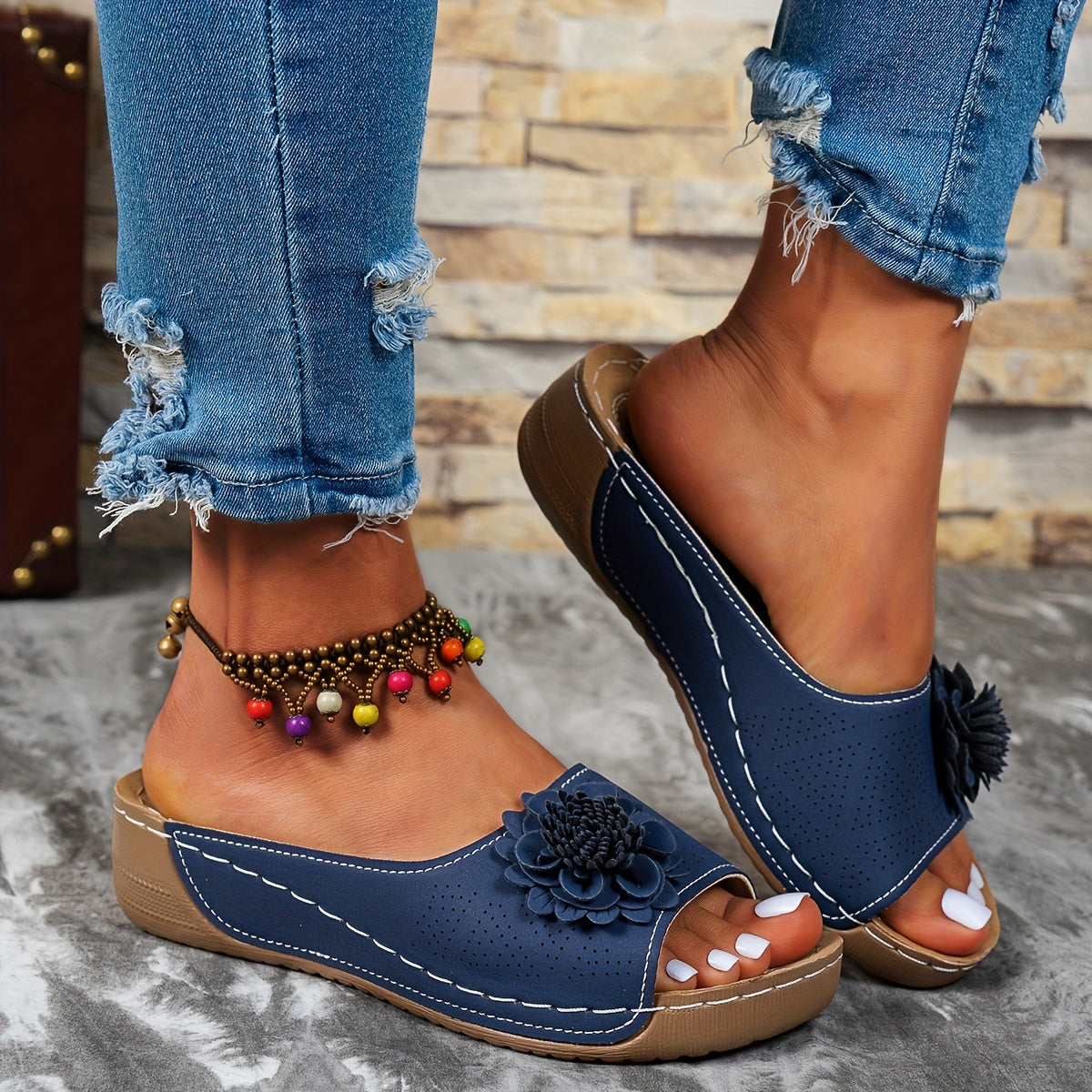 Women’s White Floral Slip-On Slippers with Open Toe and Flat Heel