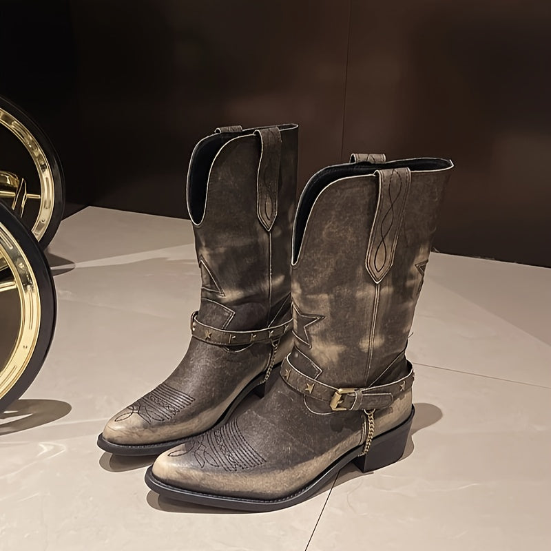 Women Western Cowboy Boots Pointed Toe Star Embroidered Mid-Calf Boots