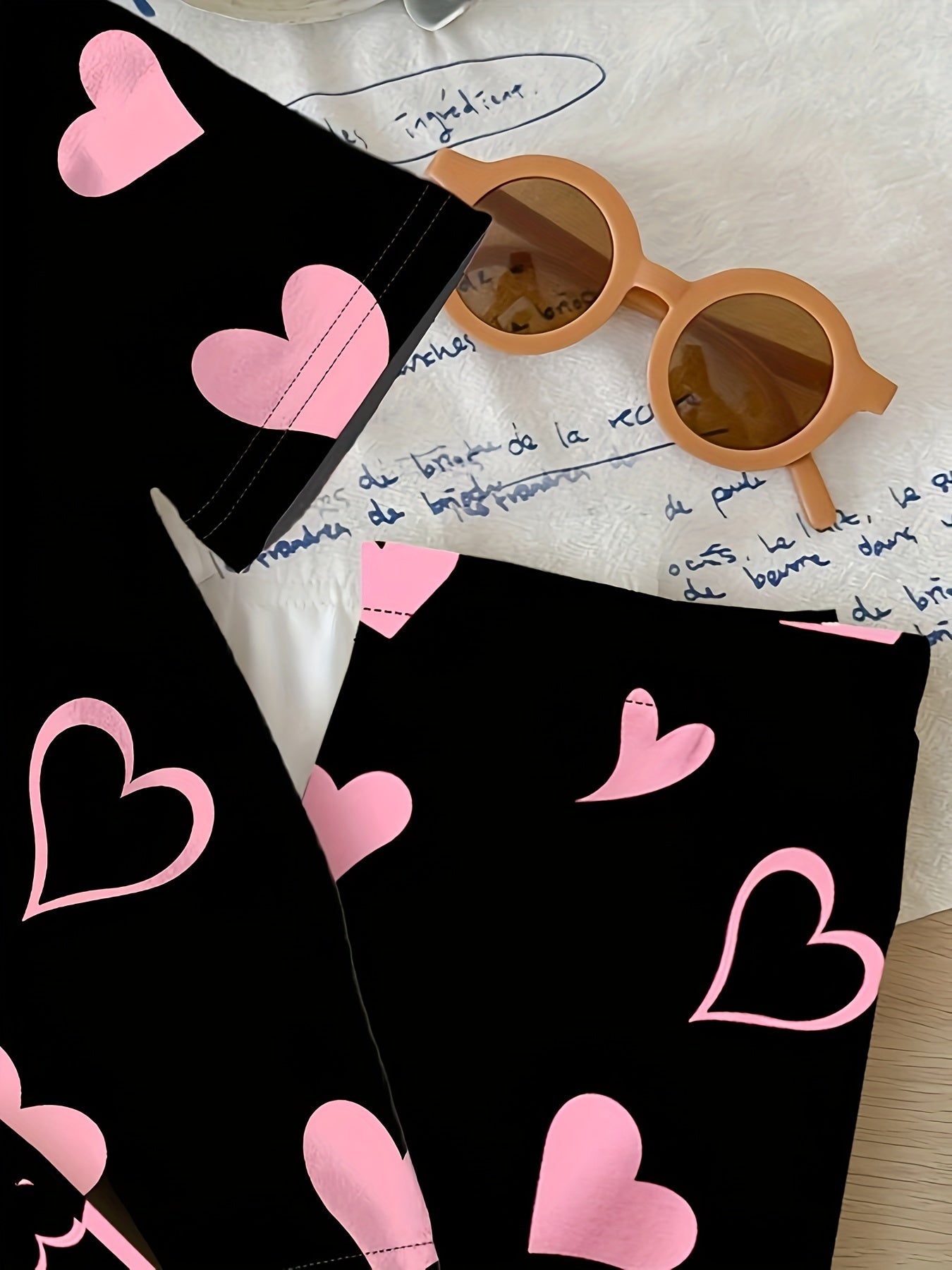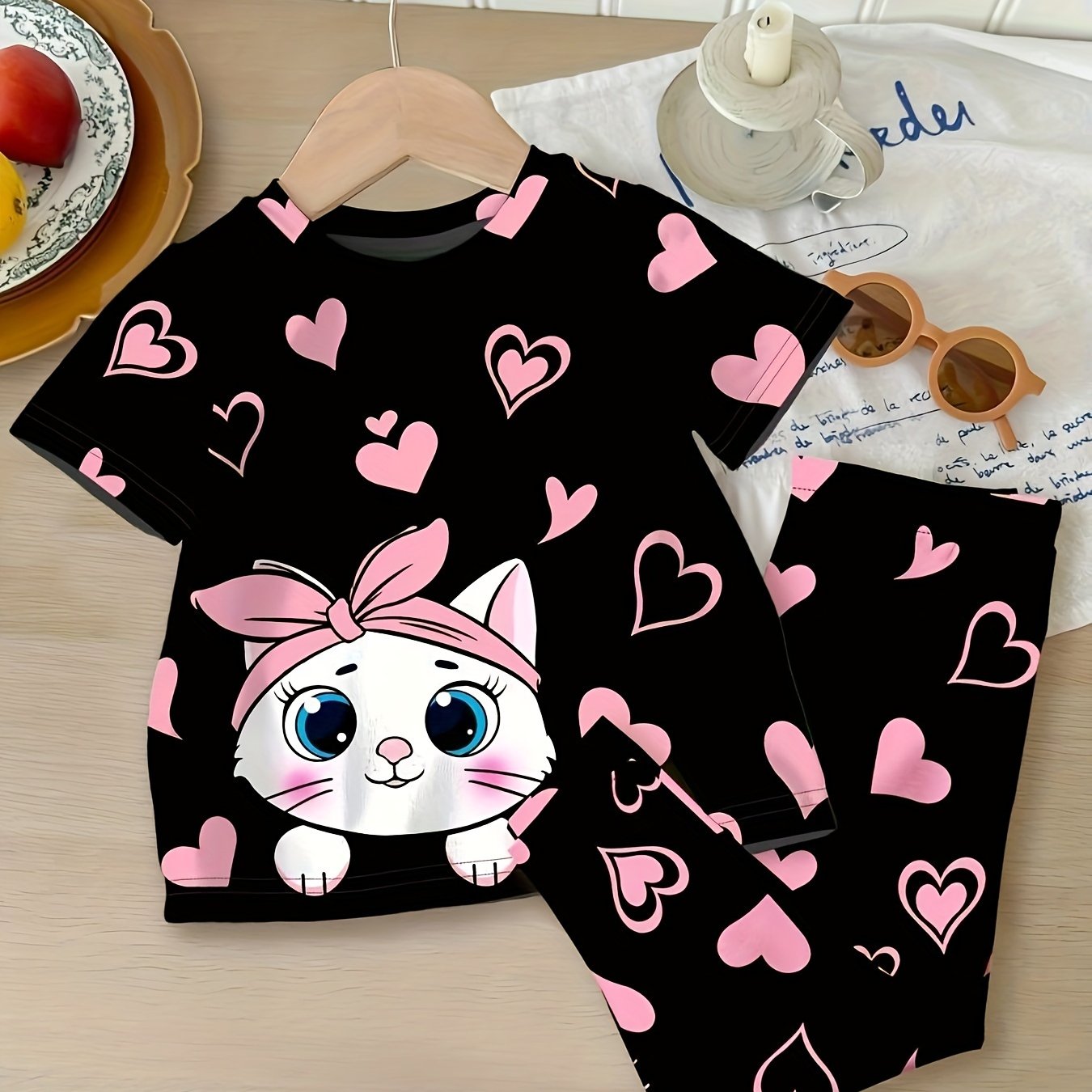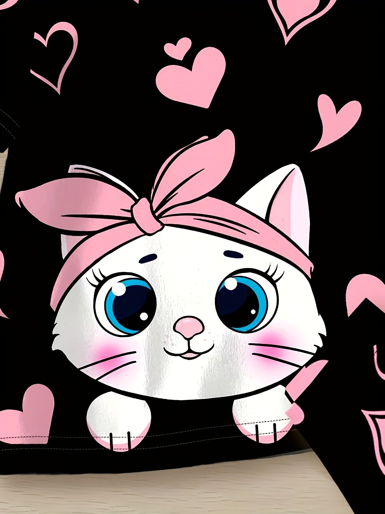 2-Piece Cartoon Cat and Heart Print Casual Outfit Set for Kids Autumn Polyester Knit