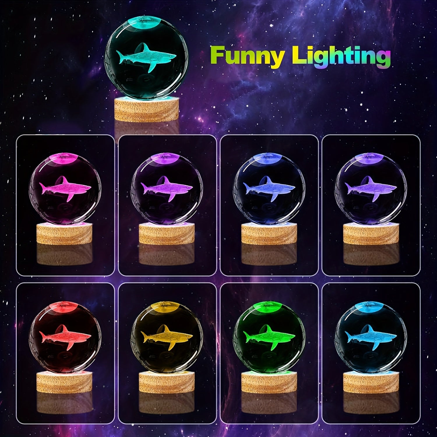 3D Shark Crystal Ball Night Light with Wooden LED Base USB Powered Bedroom Decor Gift