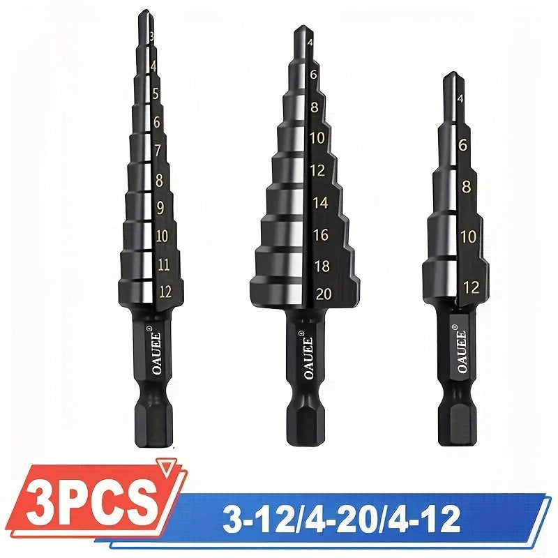 3pcs Titanium Coated High Carbon Steel Step Drill Bit Set Rust Water-Resistant for Carpentry