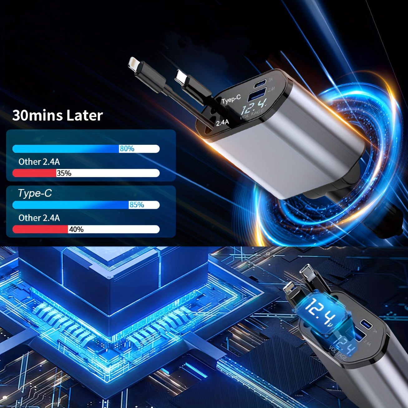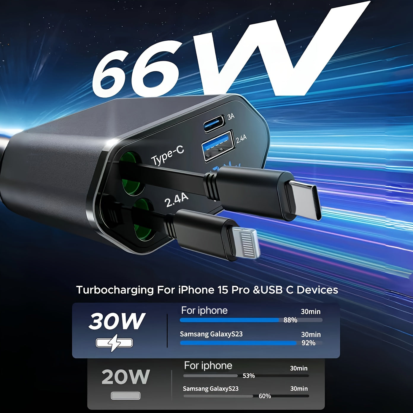 4-in-1 Retractable Car Charger with 66W PD QC3.0 and 2.6ft Cable