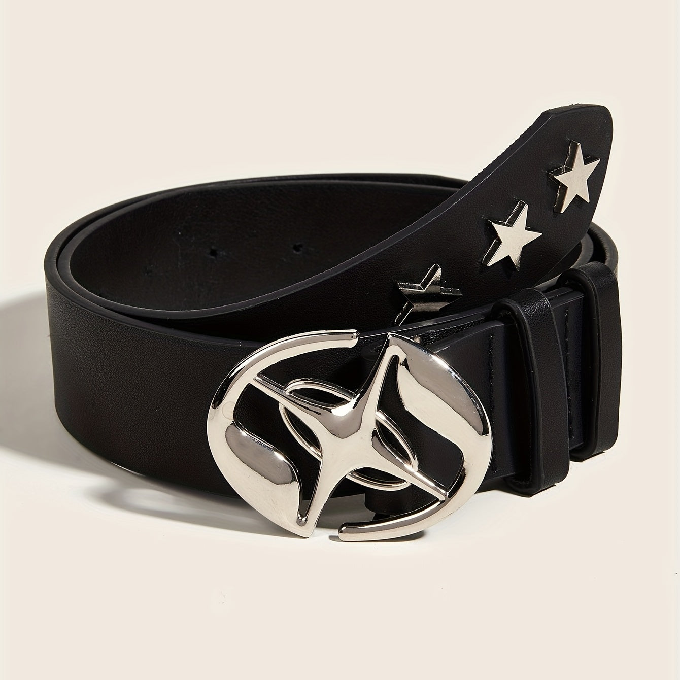 Black PU Belt for Women with Oval Hollow Out Buckle and Star Rivet Decor