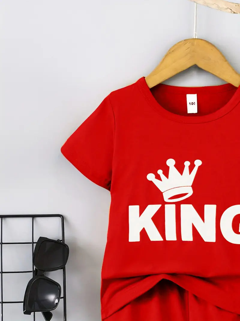Boys' Casual Outfit Set Black "KING" Crown Print Polyester T-Shirt Shorts Crossbody Bag Spring Summer