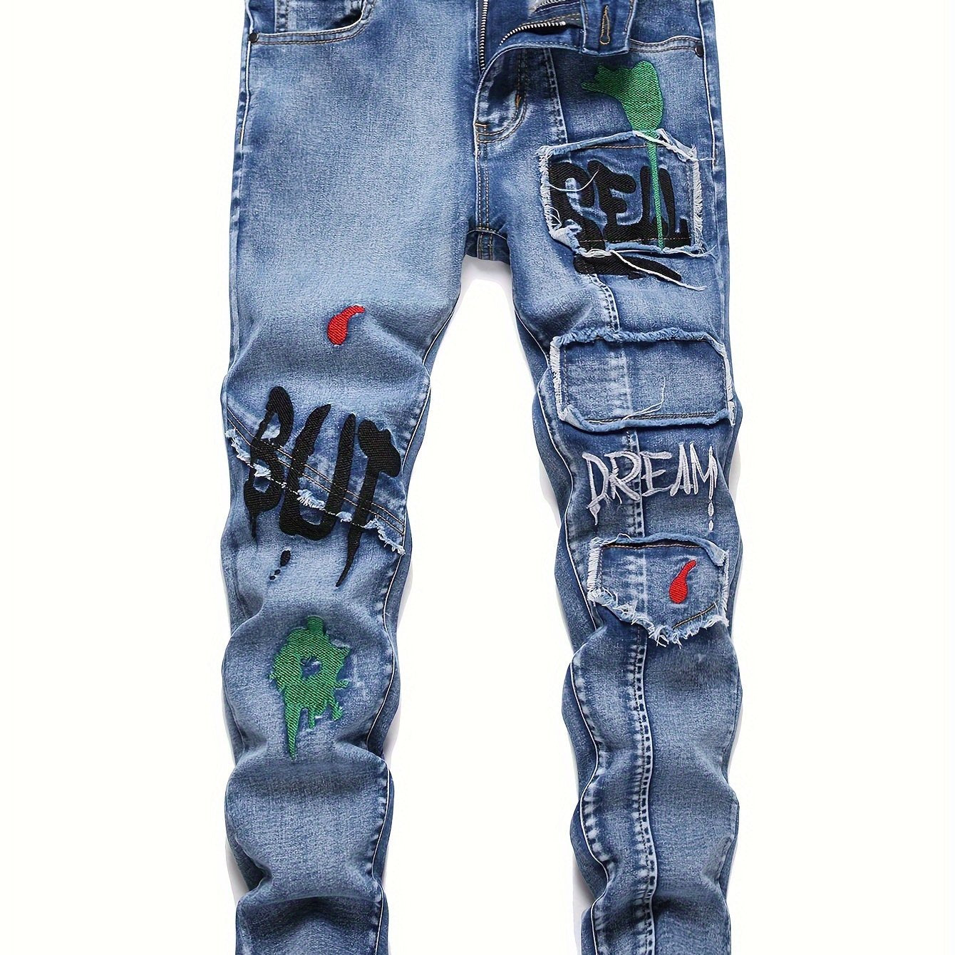 Boys Embroidered Graffiti Jeans with Elastic Waist and Cuffs Cotton Blend All-Season
