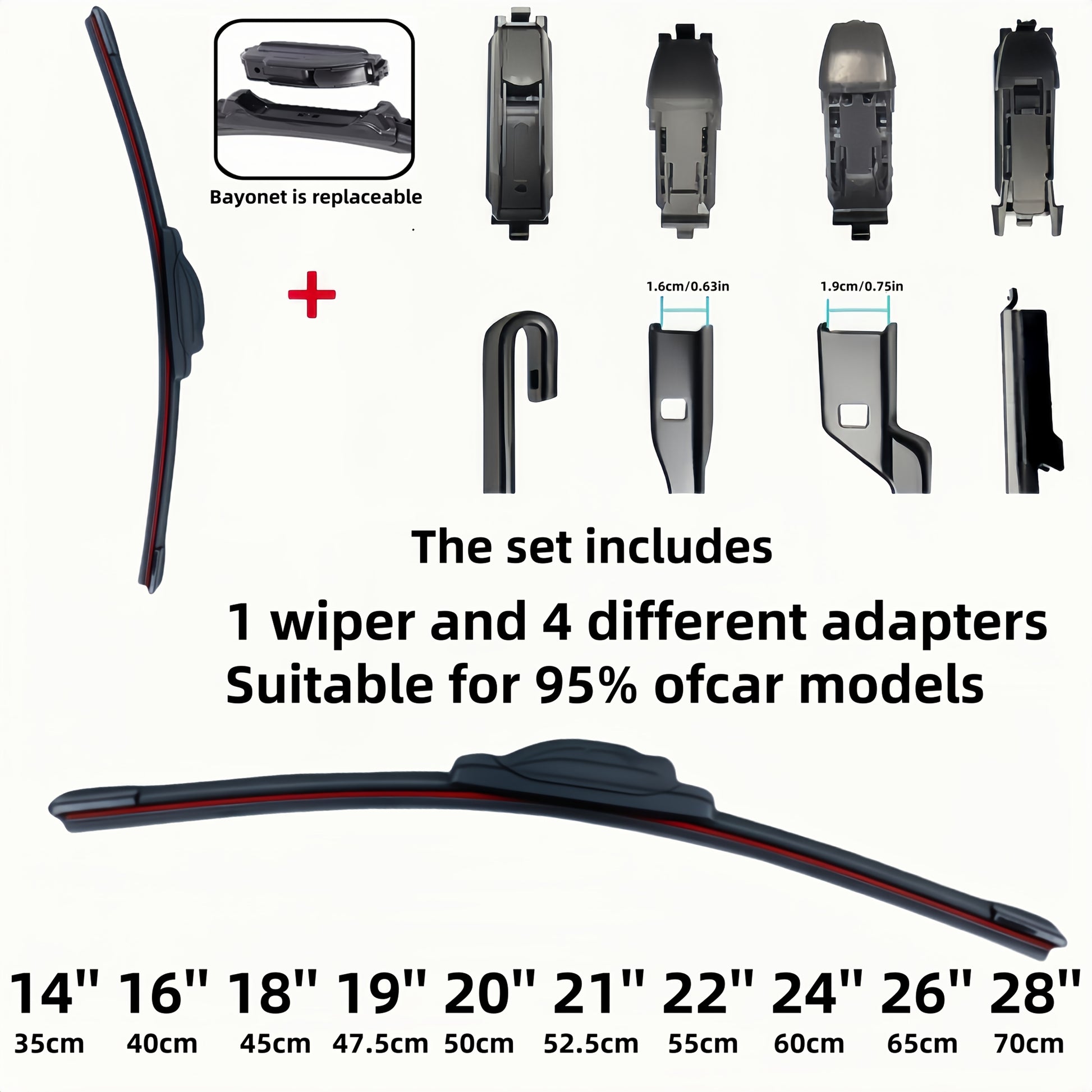 Car Windshield Wiper Blade Set with 4 Adapters, Durable Rubber, 35.56–71.12cm