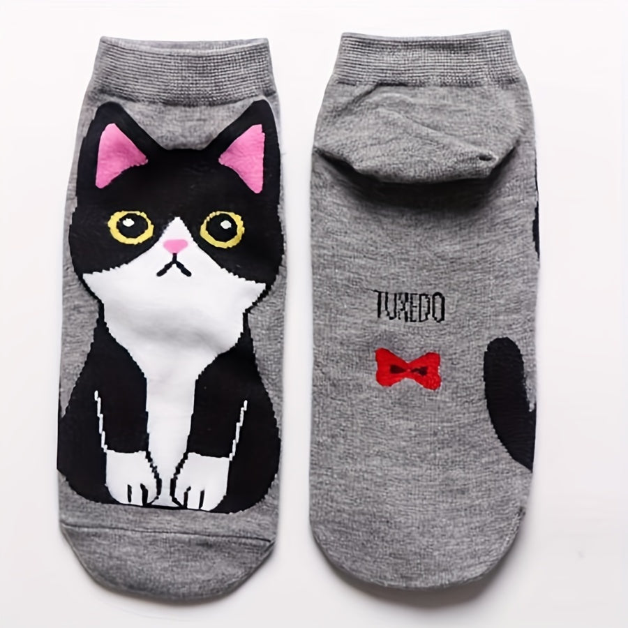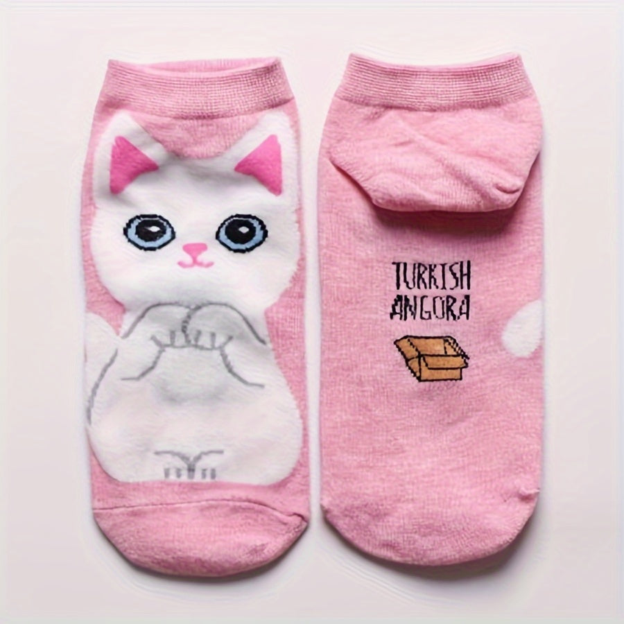 Women's Cartoon Cat Print Ankle Socks Set of 5 Breathable Knit Fabric Hosiery