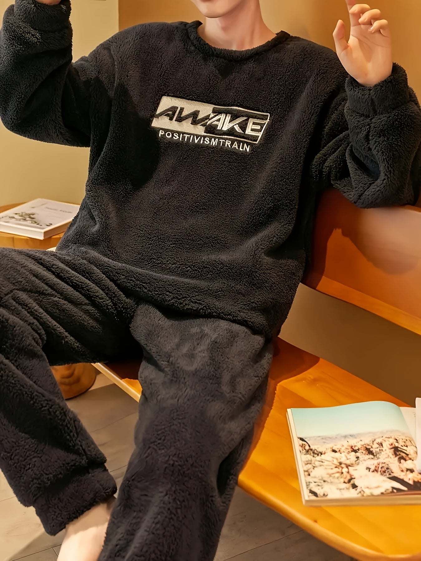 Men's Fleece Pajama Set Long Sleeve Crew Neck Loose Fit Fall Winter Lounge Polyester
