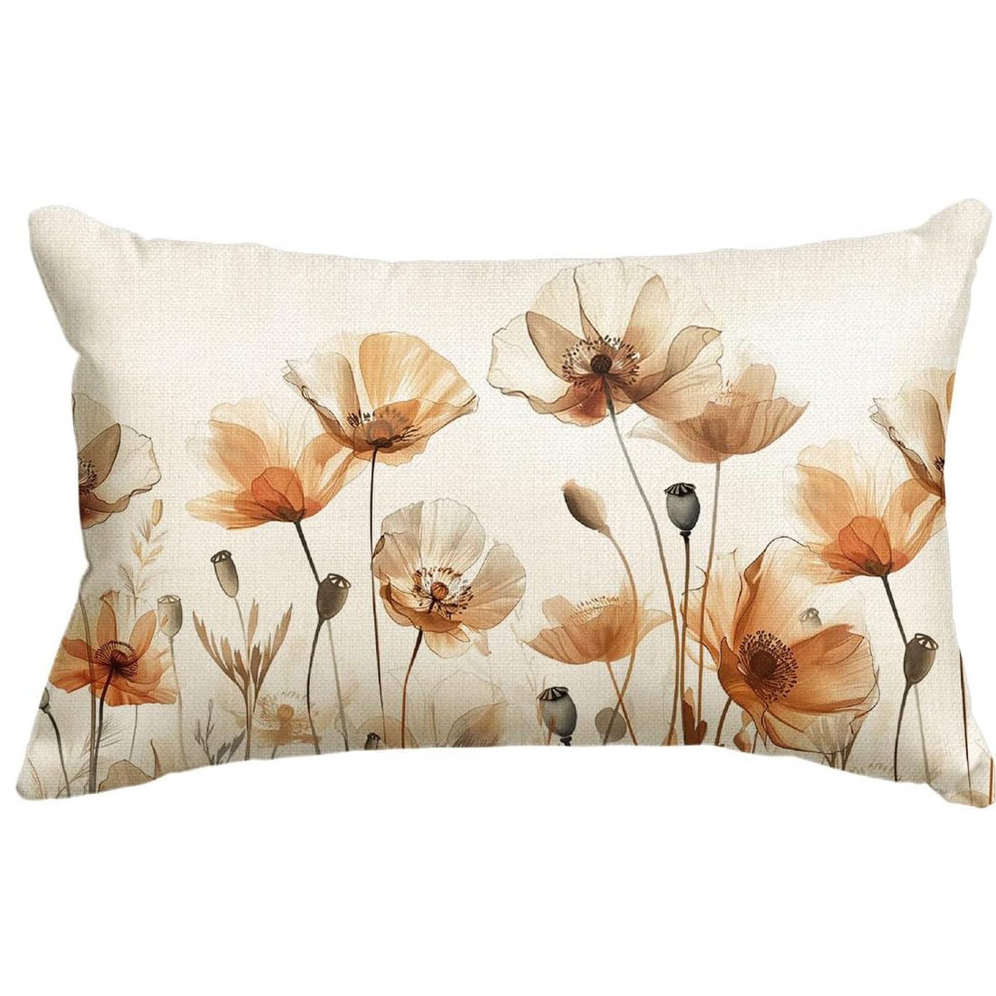 Autumn Poppy Floral Throw Pillow Cover 30x50 Linen Blend Fall Orange Brown