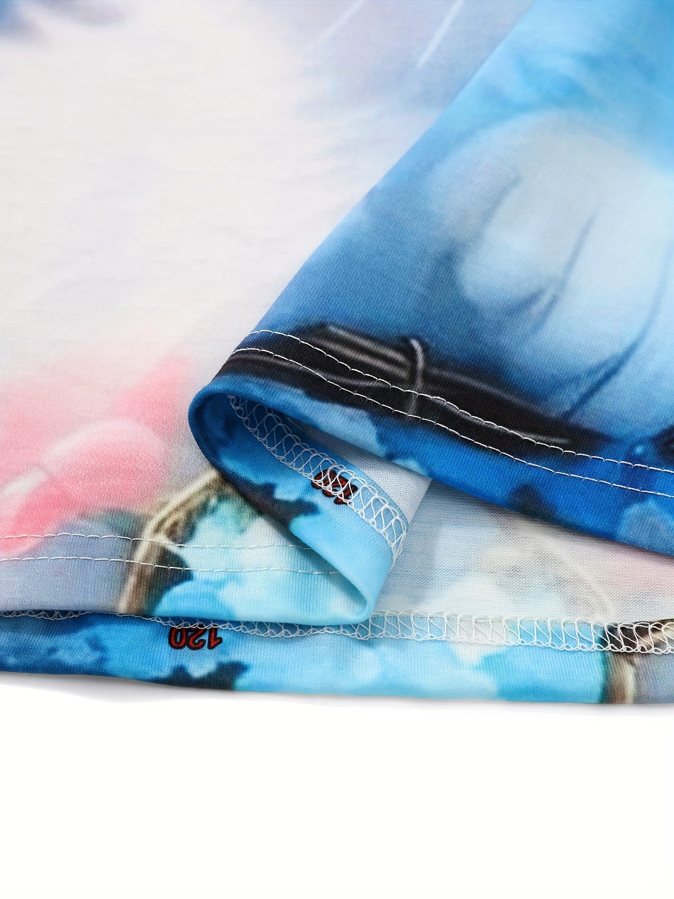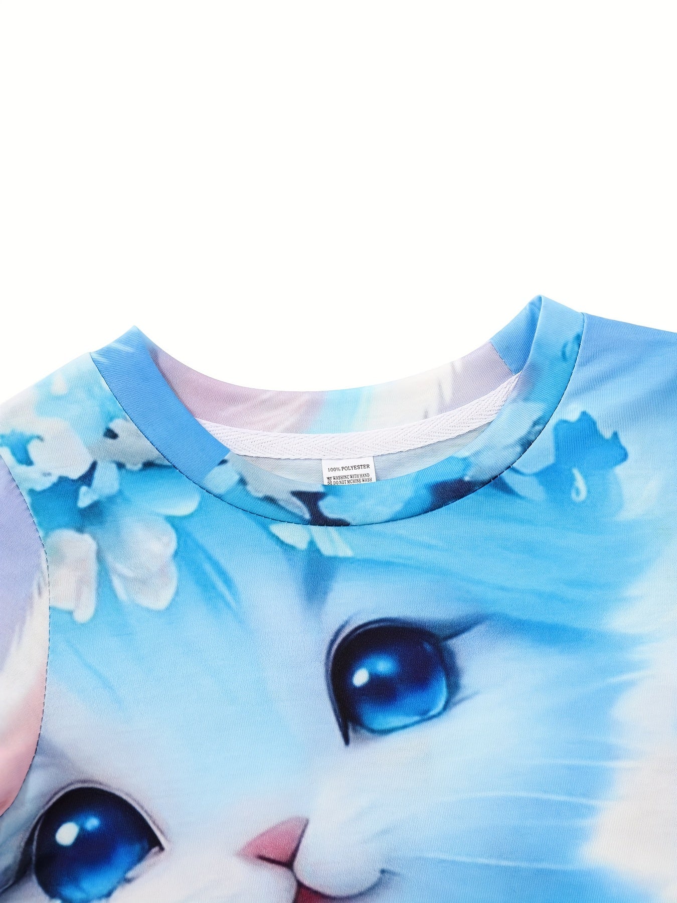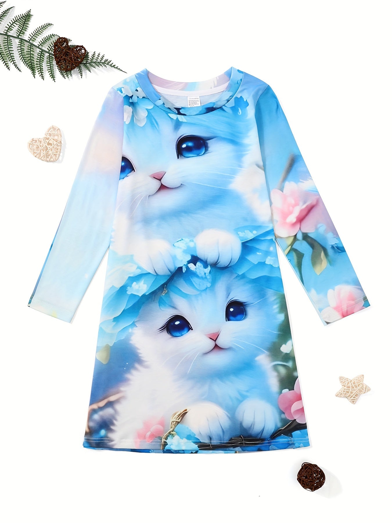 Girls Long Sleeve Dress with Kitty and Floral Pattern in Light Green Navy Blue Sky Blue