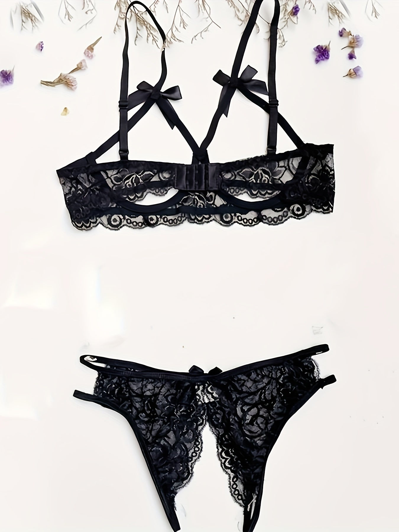 Women's Floral Lace Bow Lingerie Set Open Bust Bra Crotchless Panty