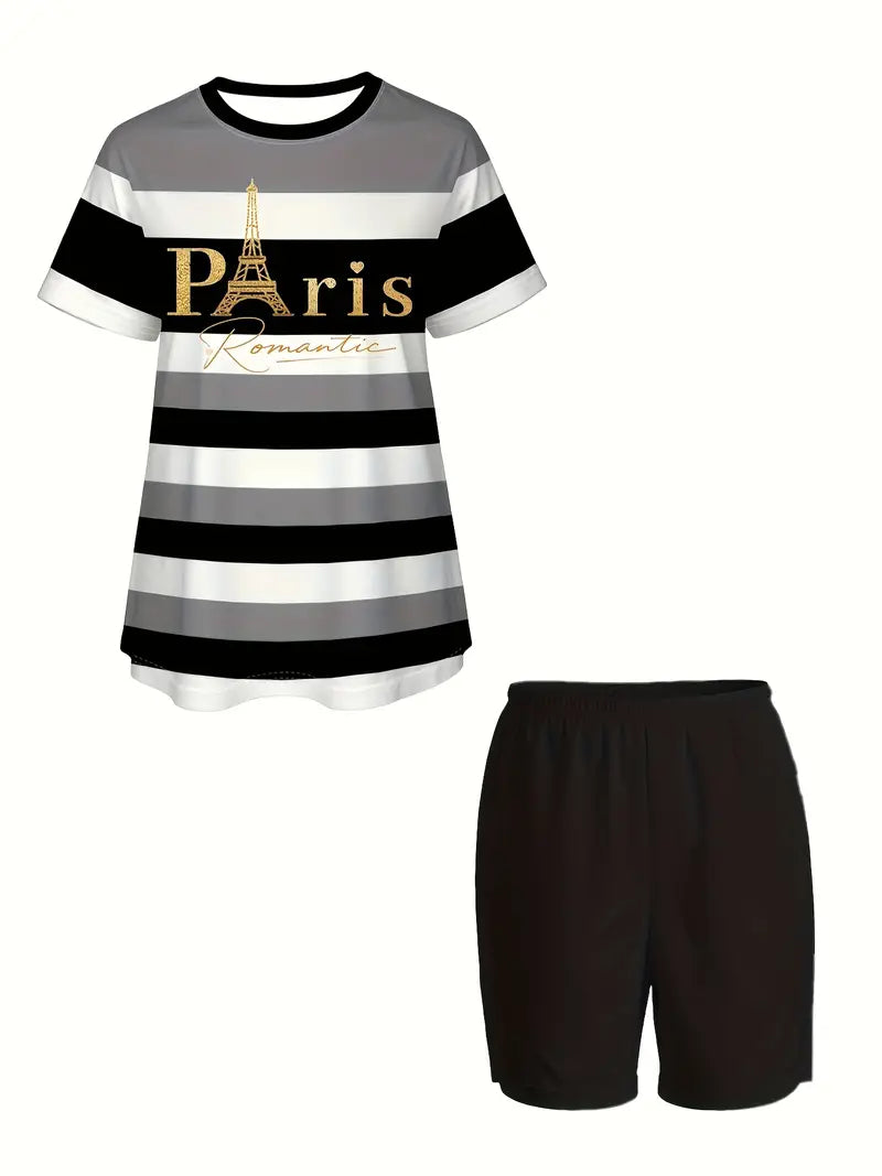 Girls Summer Short-Sleeve Top And Shorts Set Polyester Spandex Striped Letters