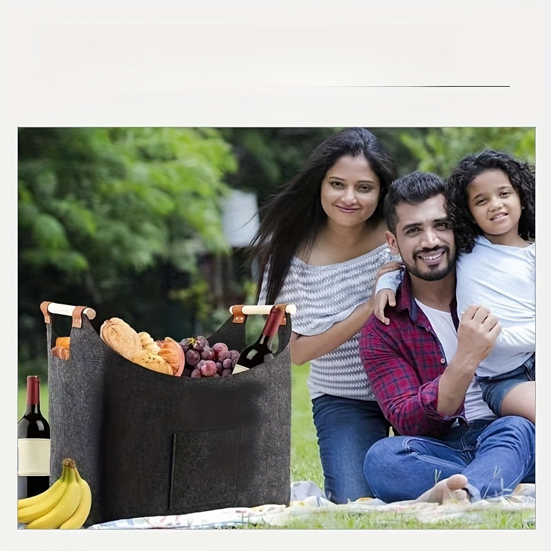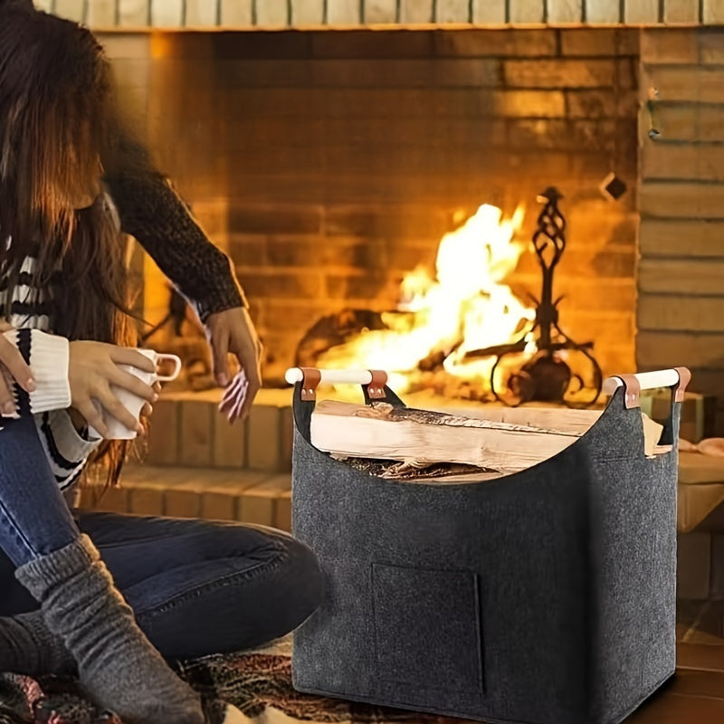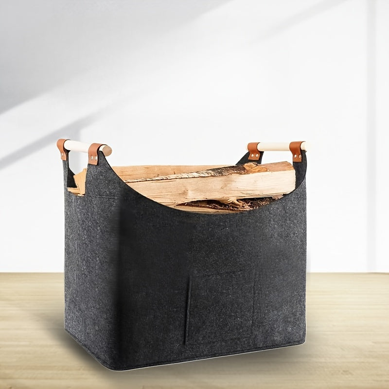 Large Felt Firewood Basket with Extendable Wooden Handle and Side Pocket