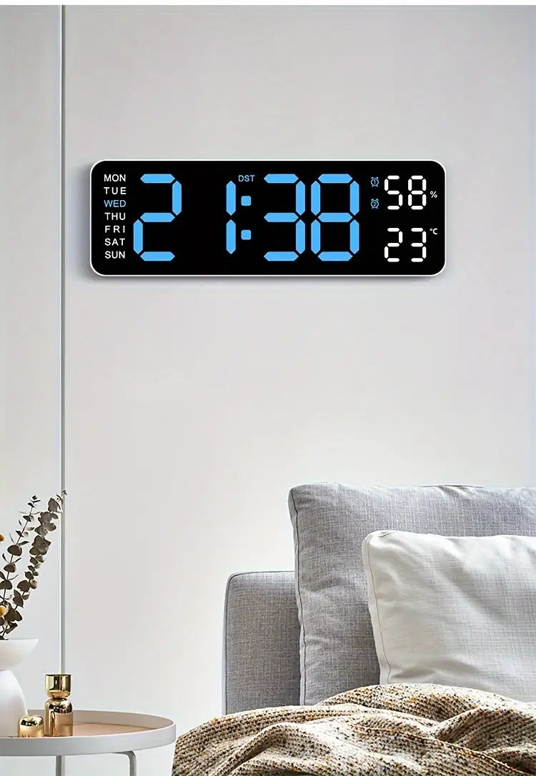 The 9-inch HD display and functional digital clock feature a large screen that allows you to see the time clearly, whether it's day or night. This digital wall clock comes with various functions: it automatically adjusts to light, shows time, date, week, temperature in °C/°F, humidity, daylight saving time, dual alarms, and offers both 12 and 24-hour formats with a snooze option. The time, week, temperature, and humidity are shown simultaneously, while the date appears separately. This digital clock is ideal for placing in a bedroom.The LED digital wall clock features an integrated light sensor and offers three distinct settings: a light-sensitive sleep mode, an automatic mode, and a manual mode for brightness adjustment.To enjoy a restful sleep, you can switch your digital wall clock to sleep mode. If you prefer constant brightness, you can manually set it to your liking. To avoid being bothered by the brightness of the LED clock, you can enable the automatic brightness sensitivity feature, which will adapt the brightness based on the surrounding environment. This approach will not only meet your preferences but also provide added convenience.The large digital wall clock requires a power connection to operate, but it features a memory function that retains the time data even during a power outage. Furthermore, the bedroom digital alarm clocks come with a dual alarm feature, allowing you to set an alarm for urgent matters to ensure timely reminders.You can adjust the alarm to fit your timetable, providing you with a reliable assurance for your travels. Ideal for kids, seniors, employees, and family members.The contemporary wall clock features an automatic daylight saving time adjustment and allows you to switch between 12-hour and 24-hour formats, enabling you to choose the time format that best fits your preferences. If your region observes daylight saving time, you can activate this feature, and the clock will automatically update to the correct time based on the date.The LED digital clock requires an external power supply and cannot operate on batteries alone. To power the clock, connect the USB port using the included USB cable and adapter. However, there is a compartment for a memory battery located at the back of the clock, which requires a pair of 1.5V AAA batteries (not included) to maintain the time memory function.This digital LED clock can serve as a desk clock and can also be mounted on the wall (two nails provided), making it ideal for various indoor settings like bedrooms, living rooms, kitchens, offices, bathrooms, hotels, and more.Light Emitting Diode ScreenThe digital clock can show the time, day, temperature, and humidity all on one screen, and it can also display the date. By pressing and holding the '+', you can bypass the date display.Information on the rear of the digital clockThe layout of the device is quite straightforward, featuring two wall decorations, a compartment for a memory battery (batteries not included; you must insert two 1.5V AAA batteries), connection ports (which include USB cables and adapters), and four buttons for various functions.