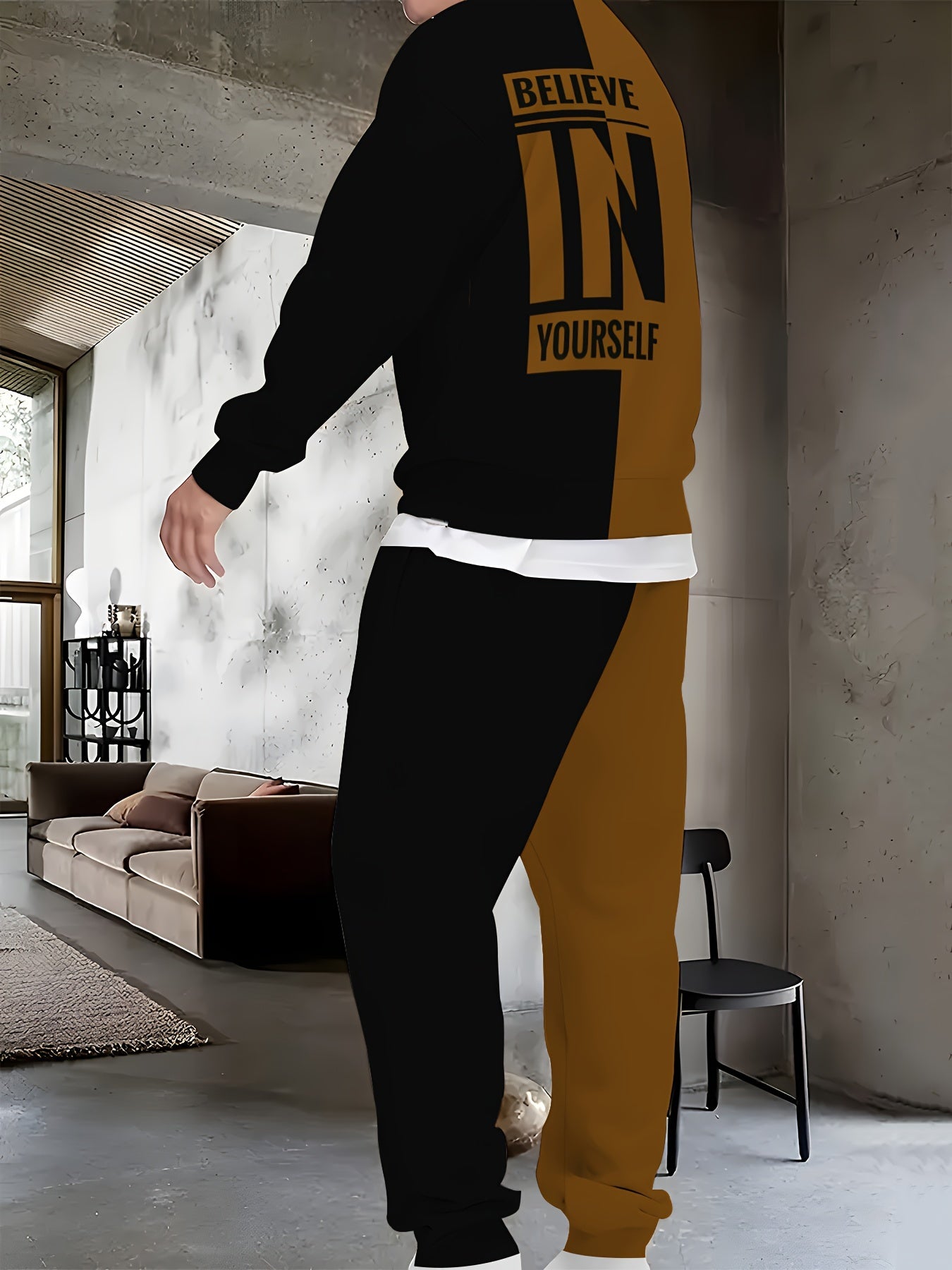 Men's Polyester Knit Tracksuit Crew Neck Long Sleeve Sweatshirt and Joggers with Believe in Yourself Print