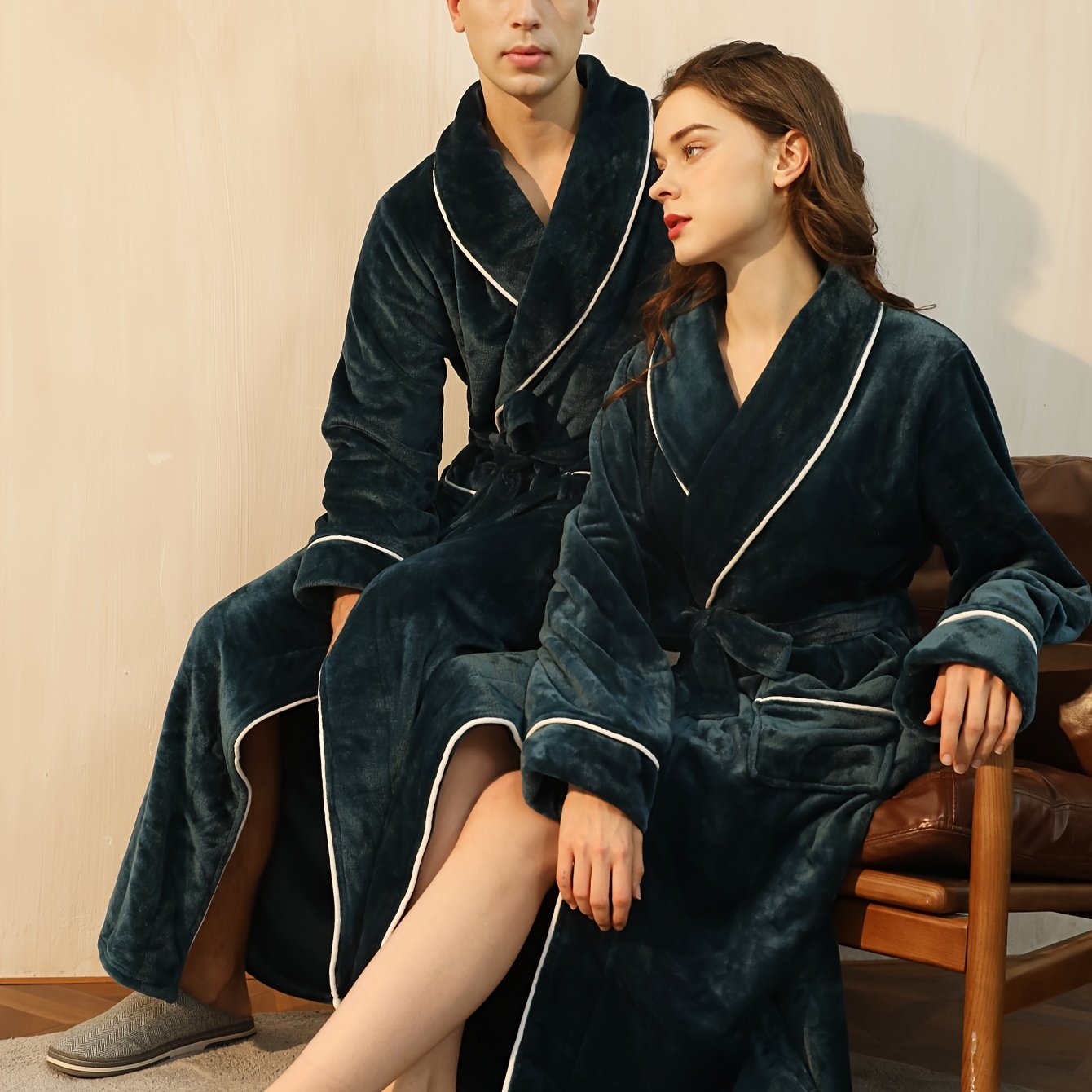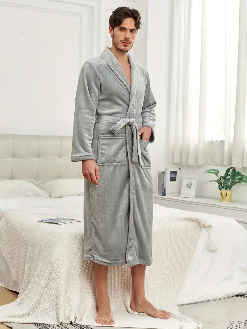 Men's Flannel Bathrobe with Coral Fleece Lining Long Sleeve Solid Color Winter Casual