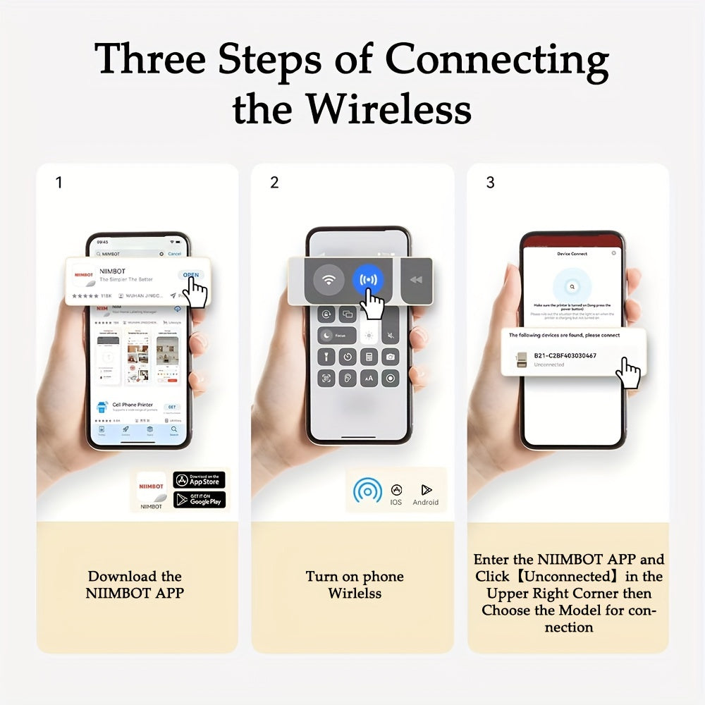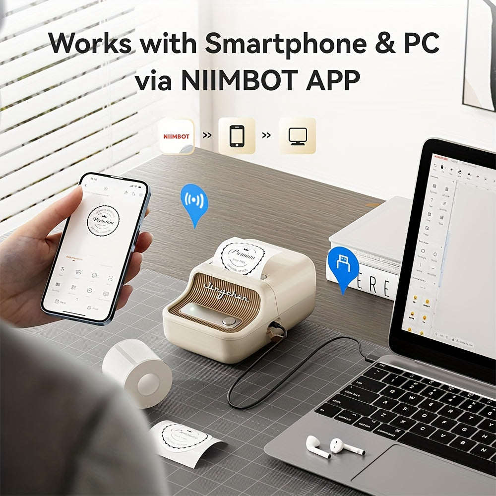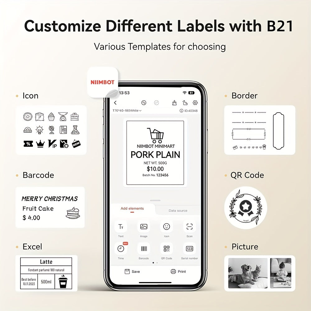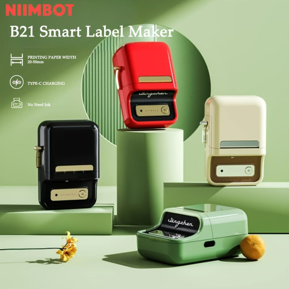 The NIIMBOT B21 label printer can print labels with a width ranging from 20mm to 50mm (0.8-2 inches). It has an effective printable width of 48mm. This label printer is suitable for various purposes, such as organizing home items like kitchen/pantry storage, as well as for business use like clothing tags, cottage food labels, jewelry, gifts, and mailing addresses. The B21 label maker machine comes with 1 roll of 50x30mm labels (230pcs/Roll) in the paper bin.By utilizing automatic label recognition and alignment, the NIIMBOT B21 label printer streamlines the printing process, making it quicker and more efficient. With thermal printing technology, there is no need for ribbons or toner, reducing the need for other consumables and saving costs.The B21 Wireless label printer offers two usage options. It can be used with iOS and Android smartphones, as well as with PCs. PC users need to download the driver from the official NIIMBOT website. Please note that it is not compatible with tablets and is not recommended for use with them. The printer is equipped with a 1500 mAh lithium battery for convenient and long-lasting printing. It can work continuously for up to 4 hours on a single charge.Customize your own label with the NIIMBOT app, which offers over 30 fonts/languages, 100+ borders, and 1500+ symbols, as well as features like Excel, QR code, OCR printing, and more. Simply download the free app, select and connect the B21 printer model from the NIIMBOT app, and start printing. The label maker will automatically turn off after 15 minutes of inactivity to save energy. You can also customize the auto power-off settings (15 minutes, 30 minutes, 60 minutes, never) according to your preferences.A versatile label maker suitable for various occasions such as home organization, weddings, parties, fashion, bakeries, jewelry, small businesses, schools, and home offices. Crafted from premium materials in an attractive retro design, this label maker is a thoughtful gift option for birthdays, anniversaries, and housewarmings.