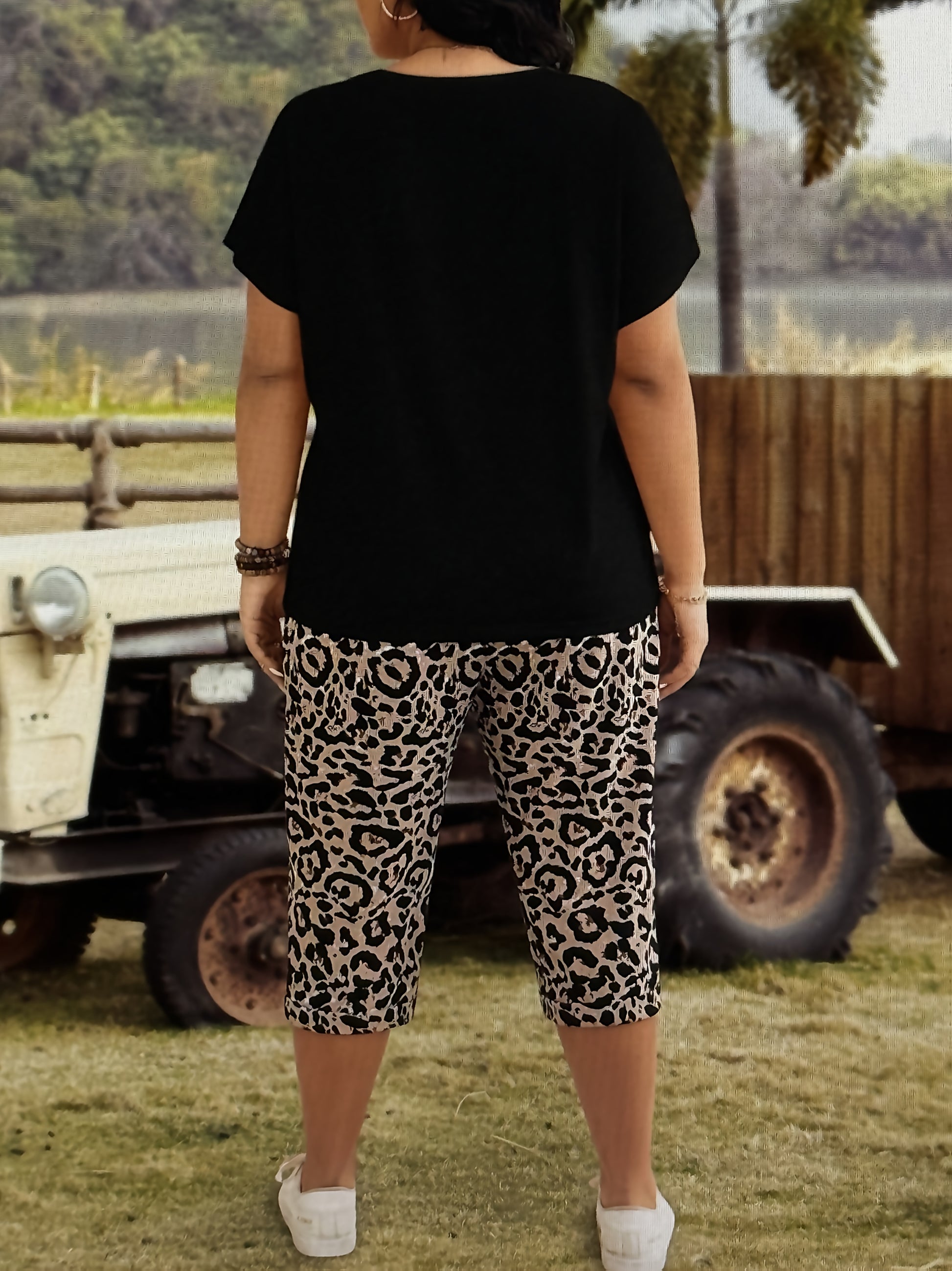 Plus Size Women's Matching Top and Pants Set with Round Neck Short Sleeves