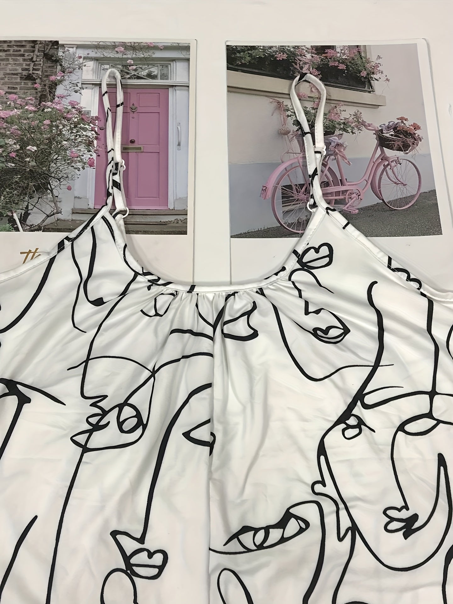 Plus Size Women’s Abstract Face Print Cami Romper Breathable Adjustable Straps