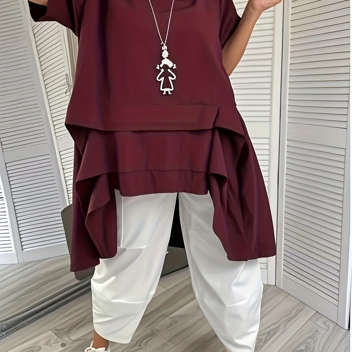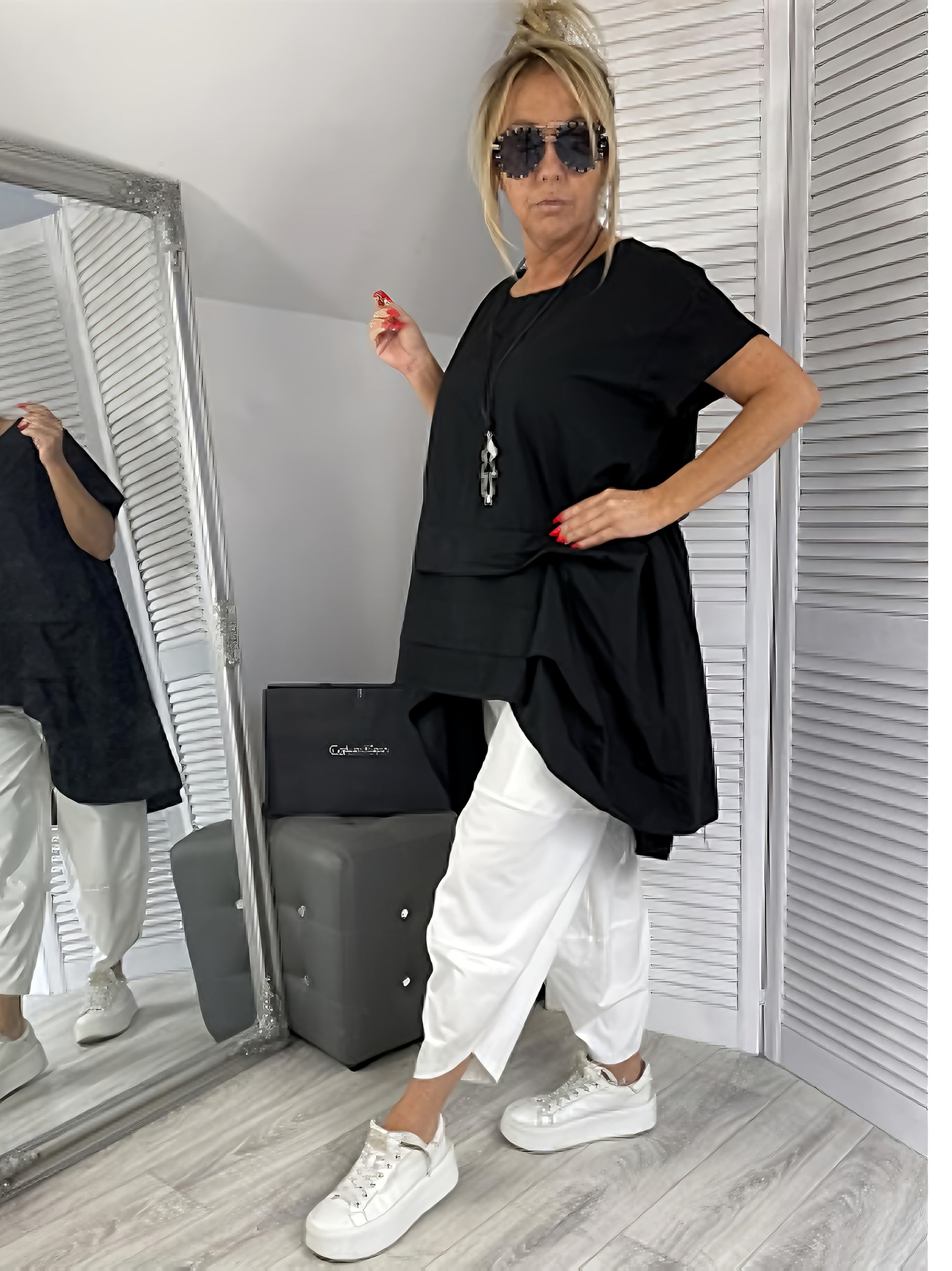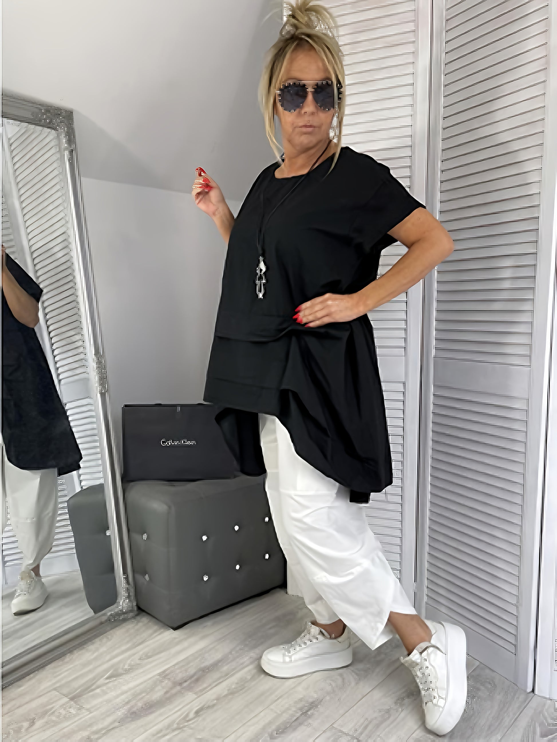 Plus Size Women's Casual Loose-Fit Cropped Short Sleeve Top Black Multi-Layer Hem