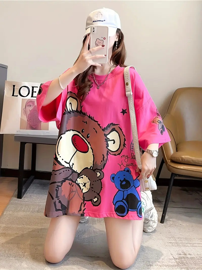 Plus Size Women's Casual T-Shirt with Cartoon Bear Print Polyester Blend Short Sleeve Spring Summer