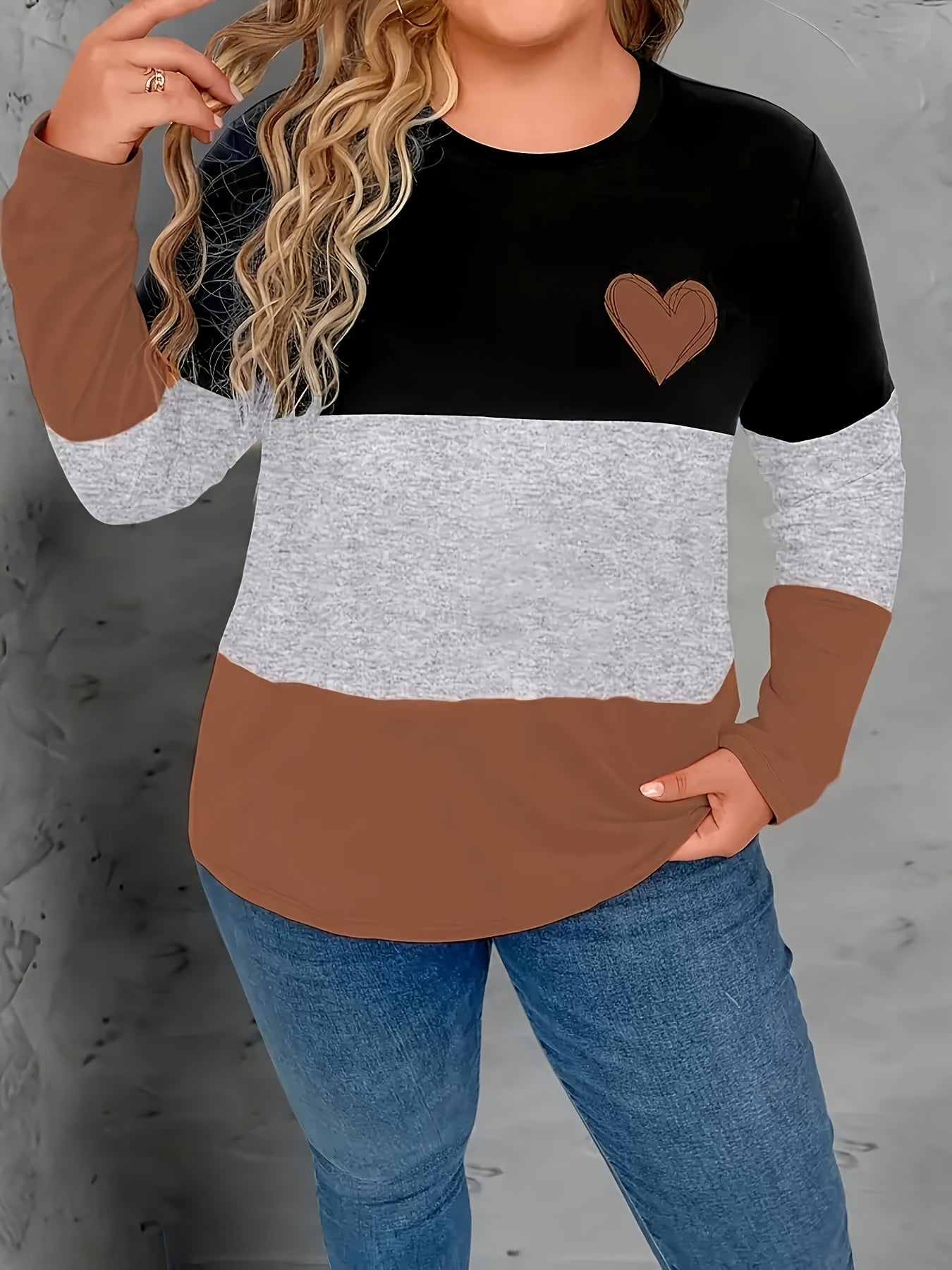 Plus Size Women's Color-Block Long Sleeve Top Polyester Blend Round Neck Casual Wear