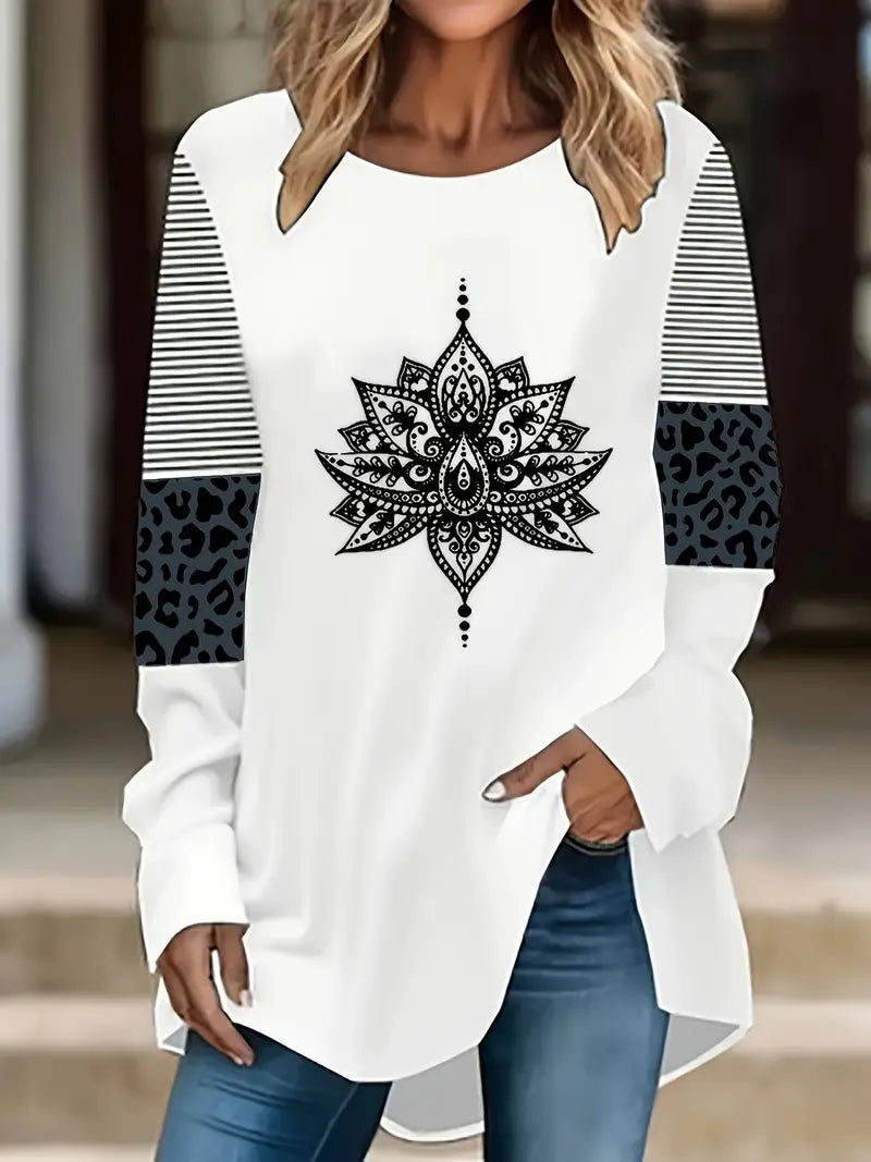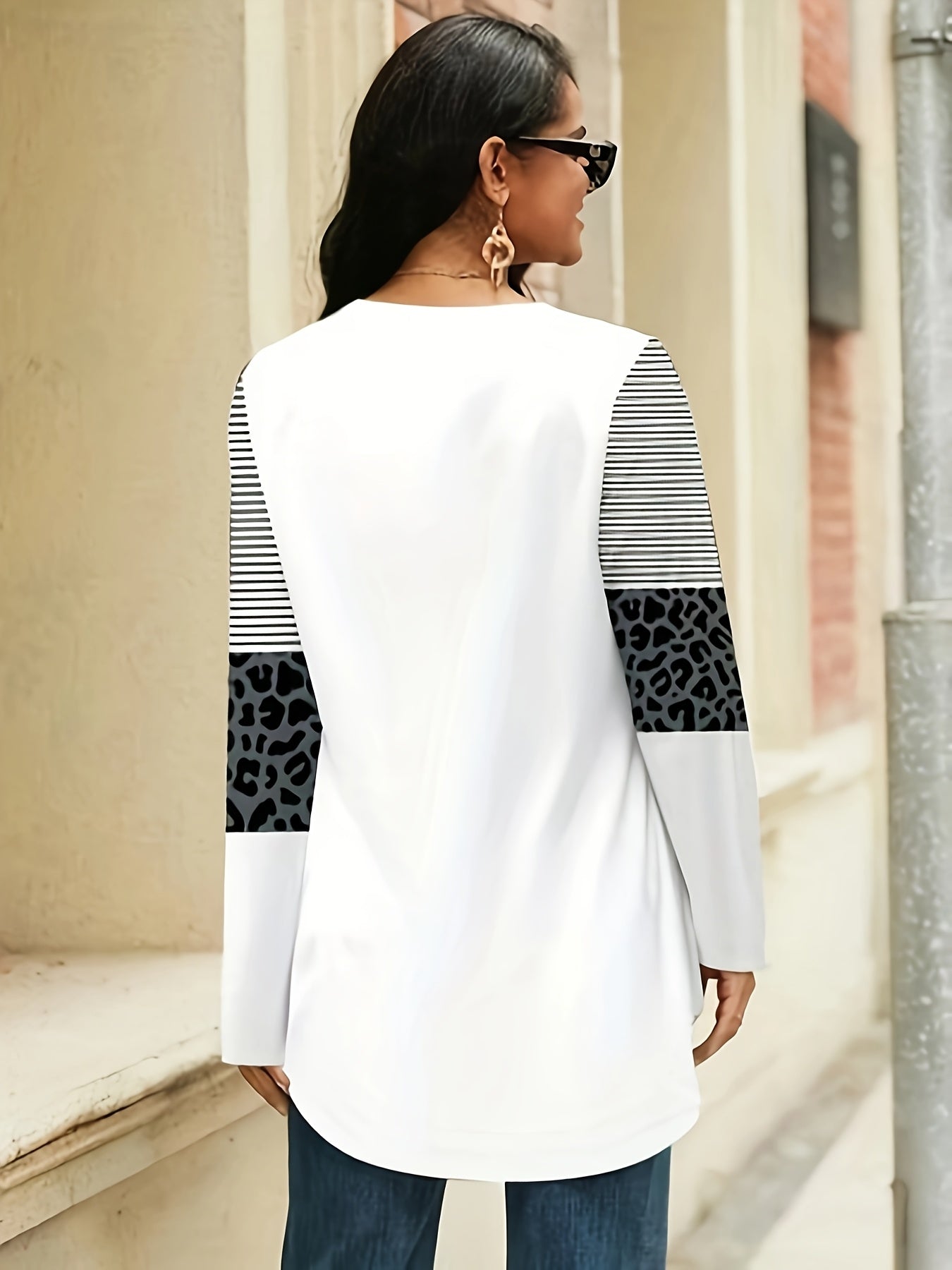 Plus Size Women's Cotton Long Sleeve T-Shirt Heart and Zebra Print White Black Brown