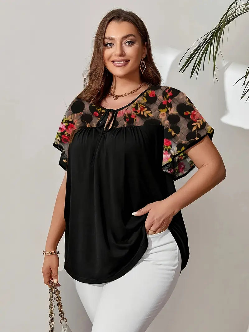 Plus Size Women's Black Floral Blouse with Tie-Front and Butterfly Sleeves