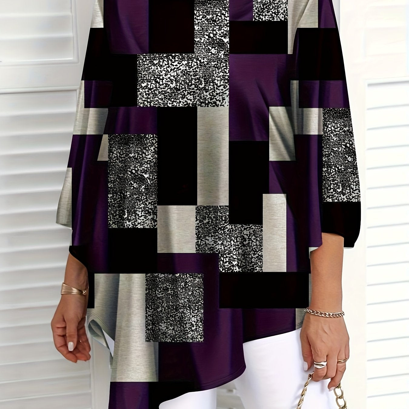 Plus Size Women's Geometric Print Asymmetrical Top Crew Neck Green Black