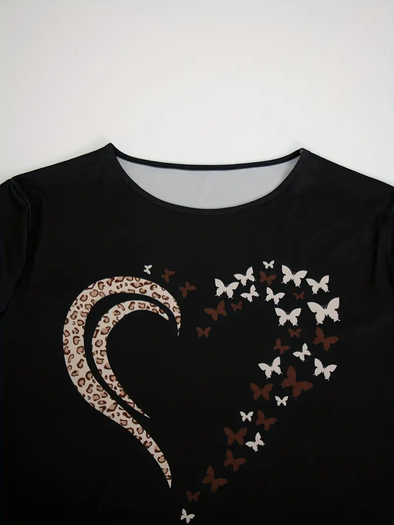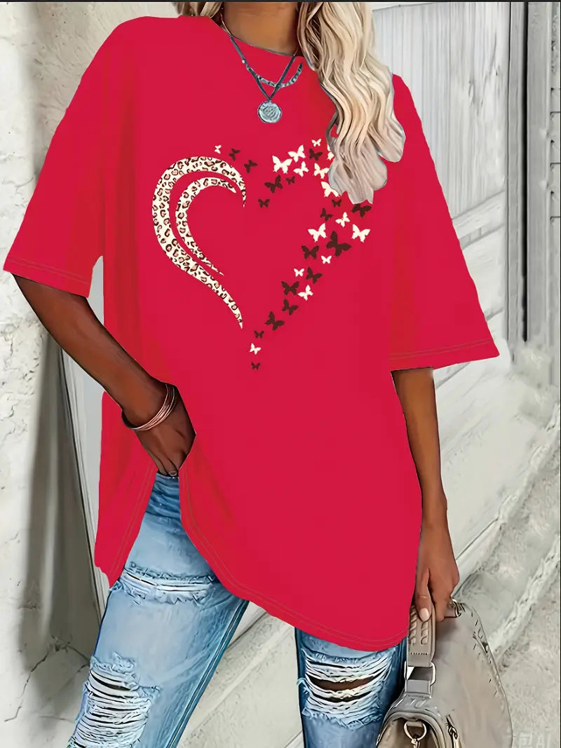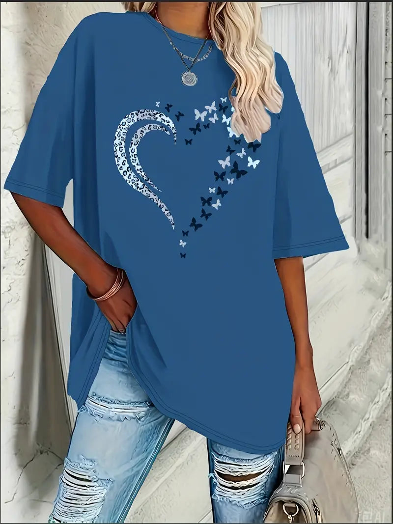 Plus Size Women's Light Blue Floral Heart T-Shirt Casual Short Sleeve Loose Fit