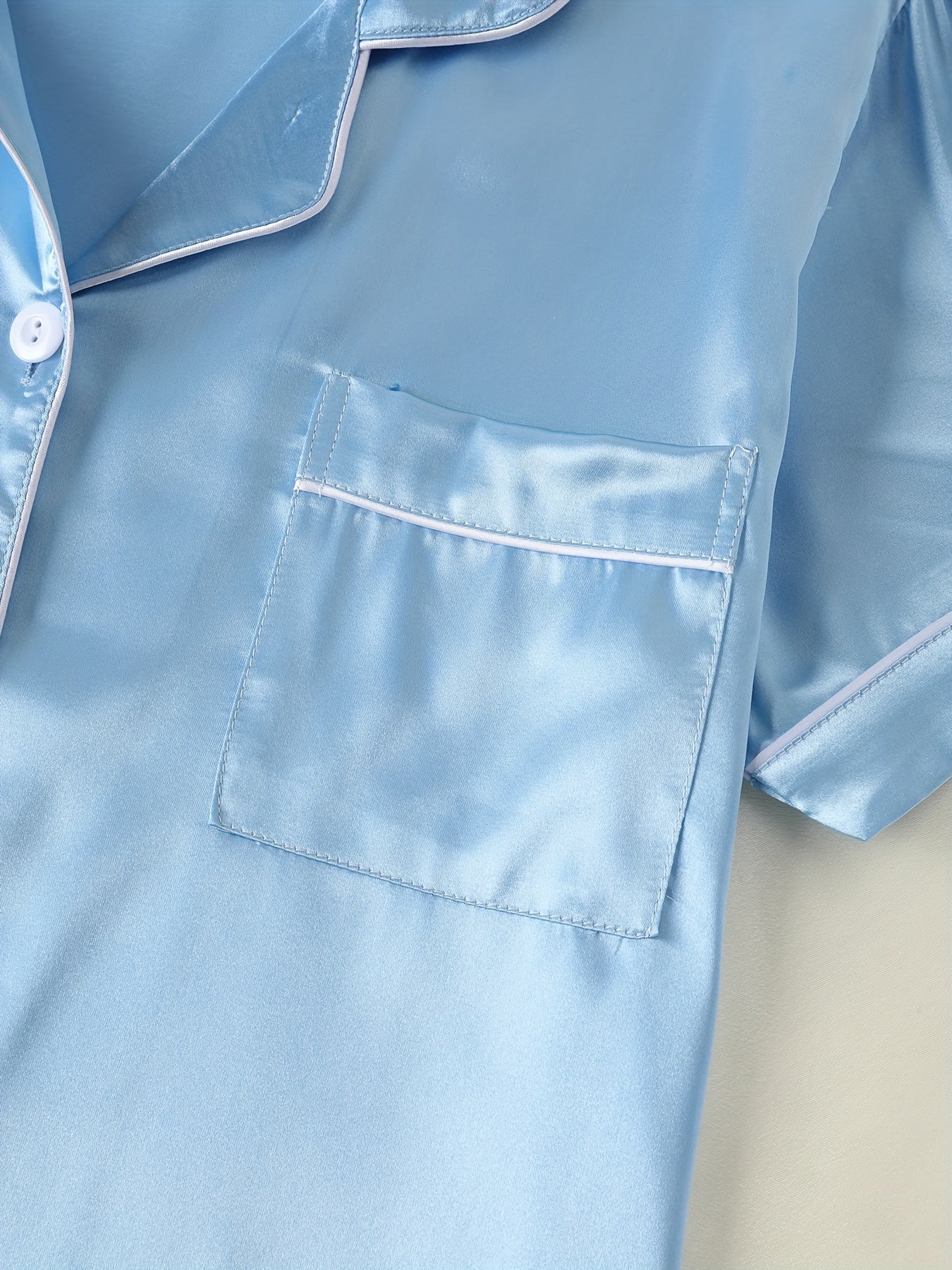Women's Satin Lounge Set Short Sleeve Button-Up Top with Lapel Collar and Elastic Shorts