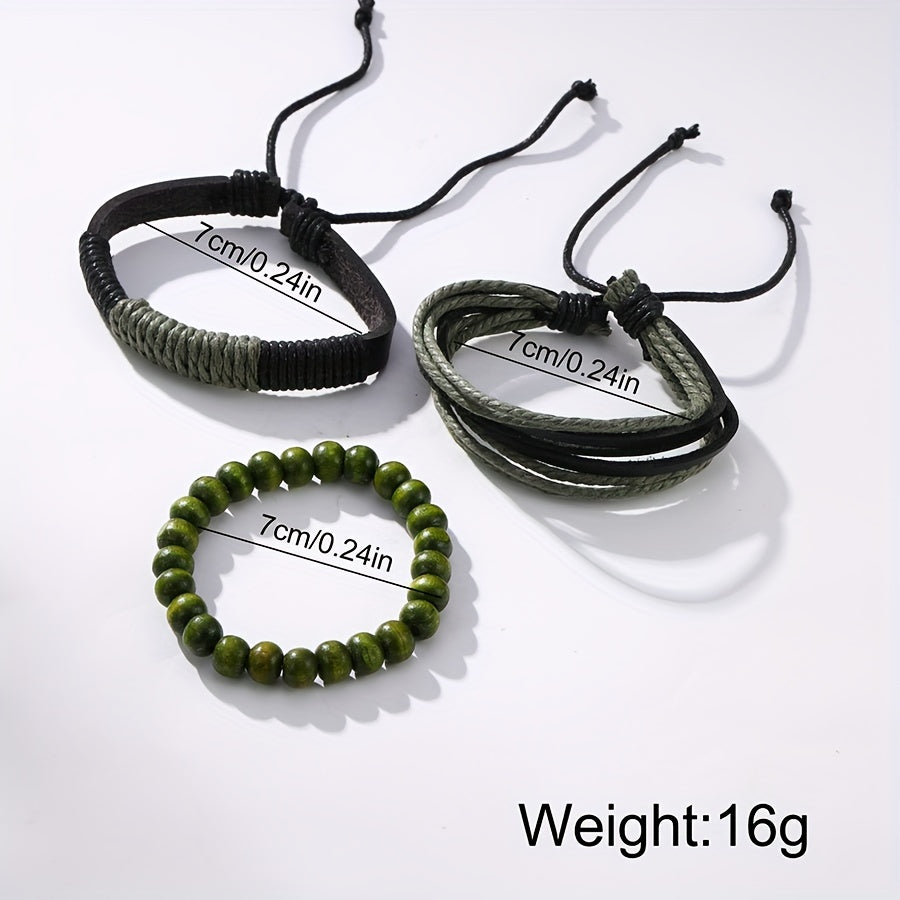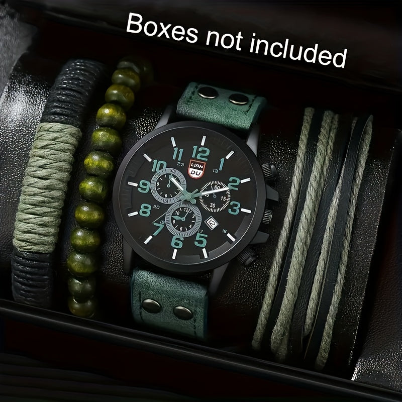 Men's Quartz Watch and Bracelets Set with Round Calendar Dial and Leather Straps