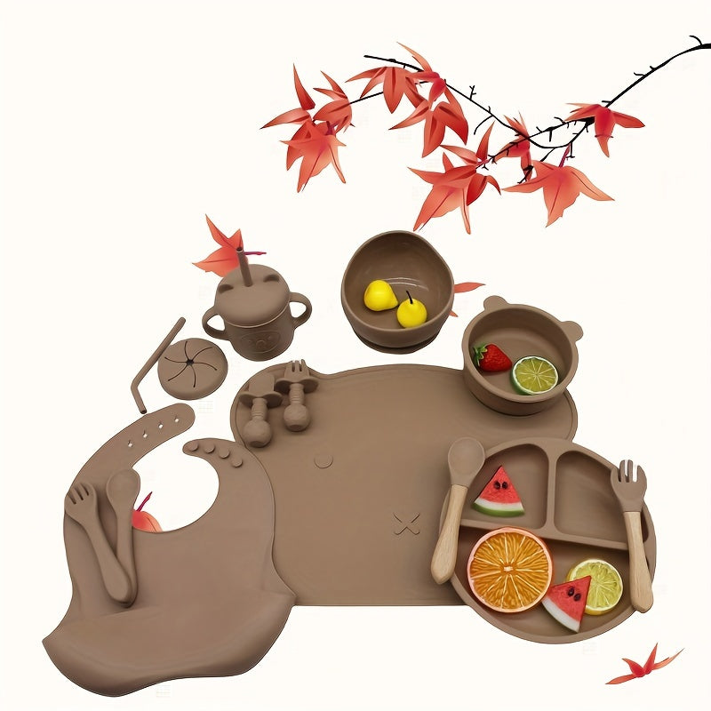 Children's Silicone Feeding Set 9pcs Divided Plates Sucker Bowl Bib Drinking Cup