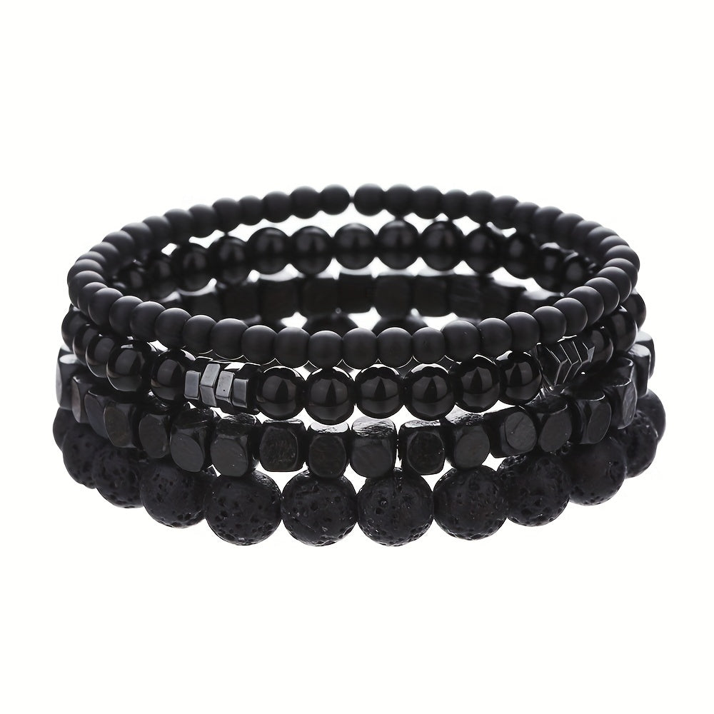 Set of Four Black Stone Volcanic Rock Wood Bead Bracelets for Men Fashion Accessory