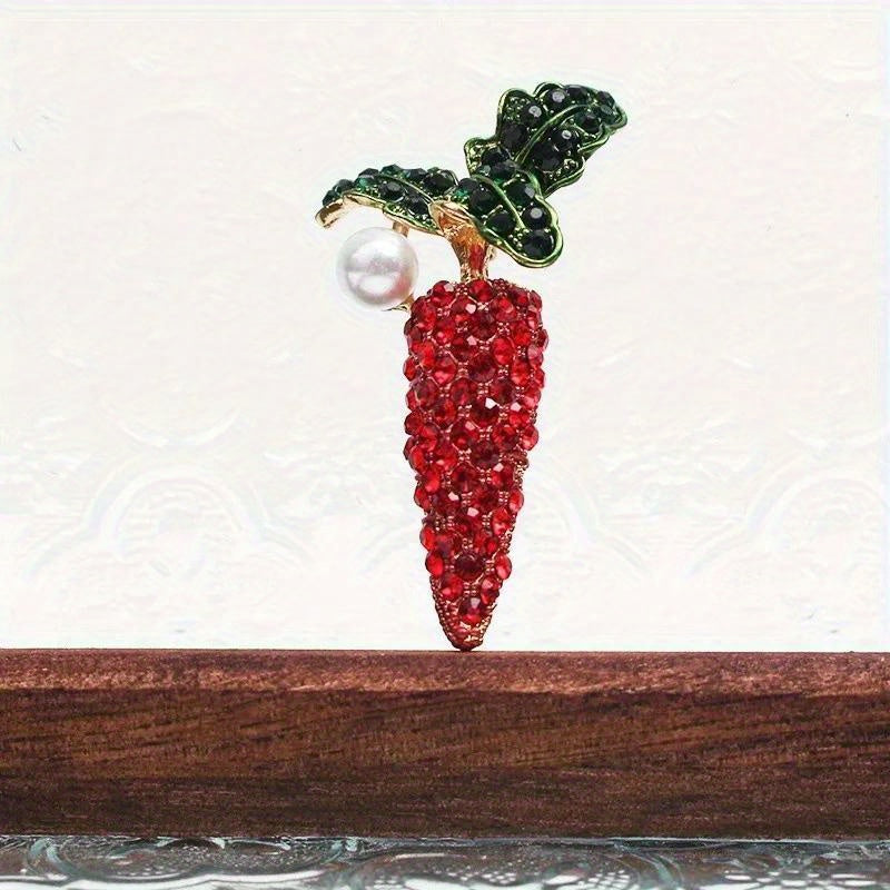 Crystal Carrot and Faux Pearl Brooch, Rhinestone Plant Shape for Women