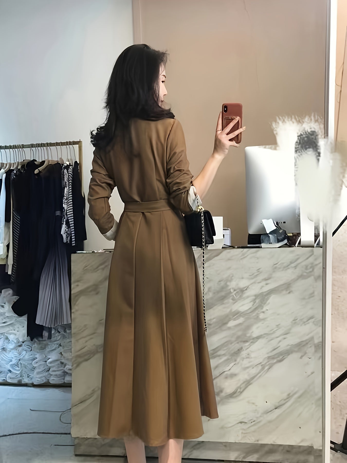 Women's Brown Polyester Midi Dress with V-Neck A-Line Belt for Spring Summer Fall