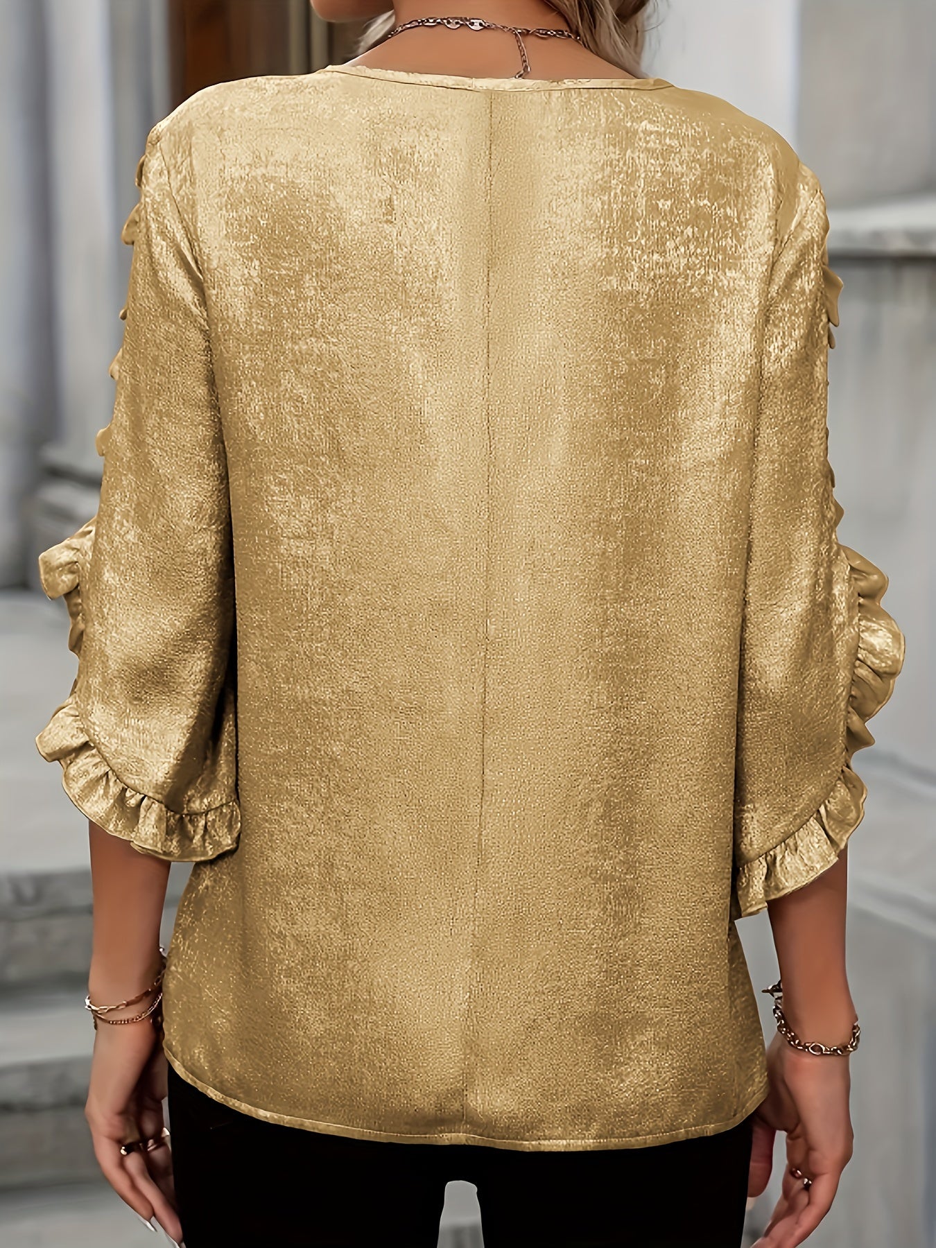 Plus Size Ruffle Detail Blouse with Crew Neck Short Sleeves Polyester Elastane for Spring Fall