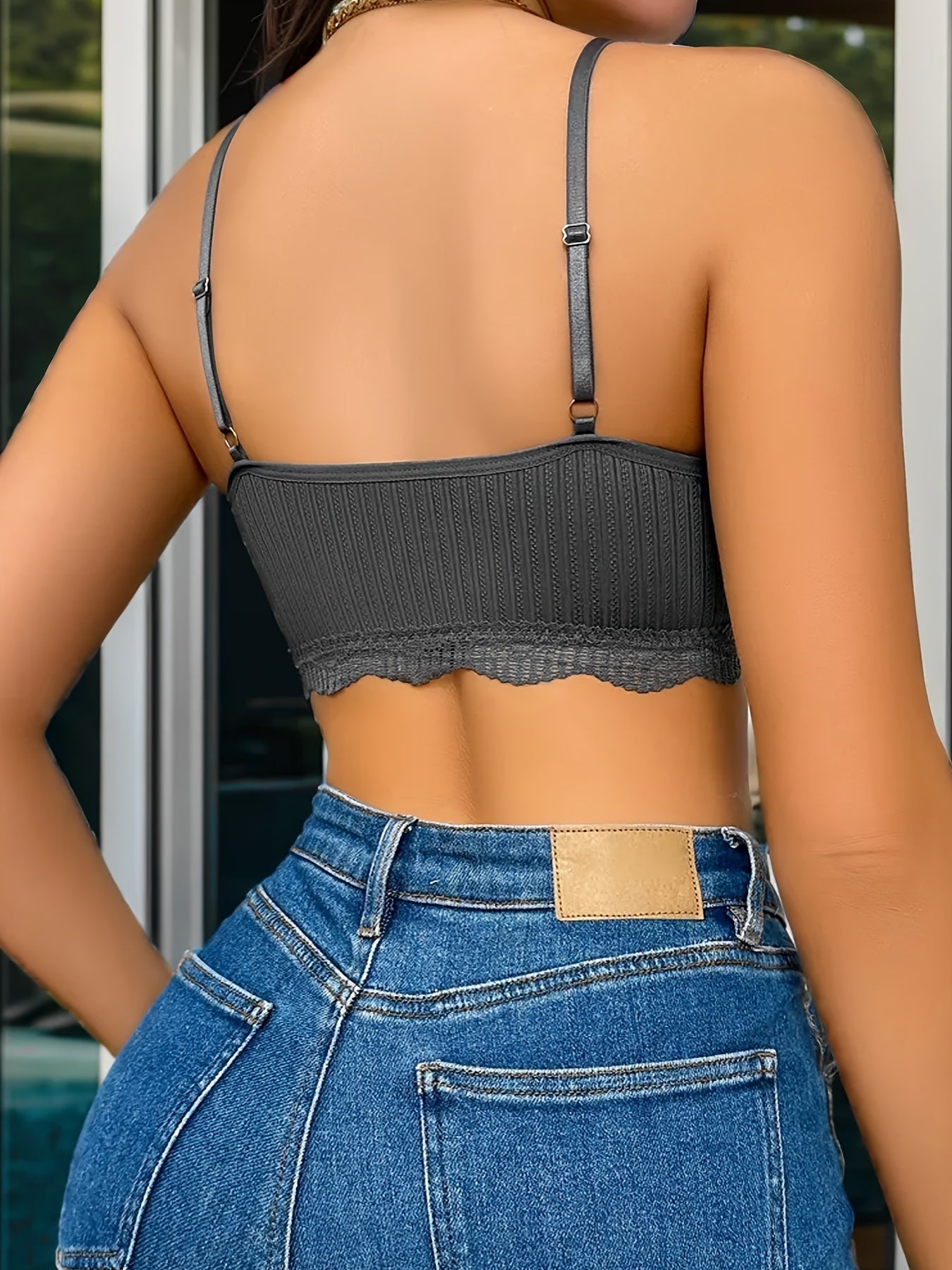 Women's Wireless Bra with Lace Trim and Breathable Ribbed Fabric