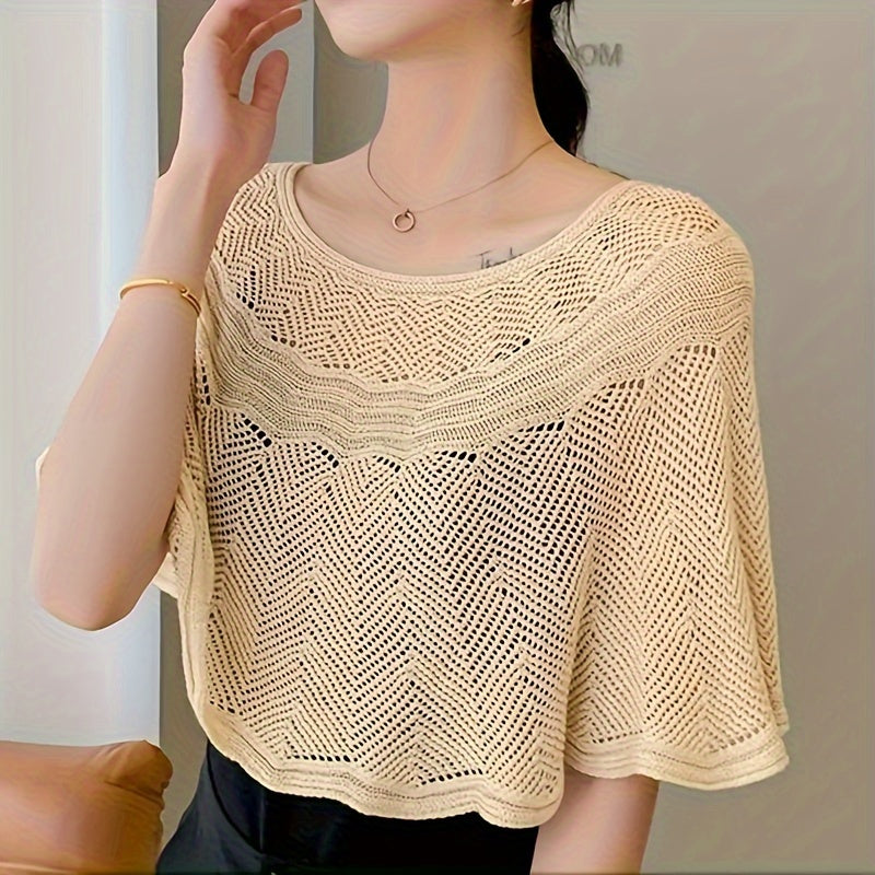 Women's Elegant Pullover Cape with Hollow Knitted Shawl, Loose Fit, Solid Color
