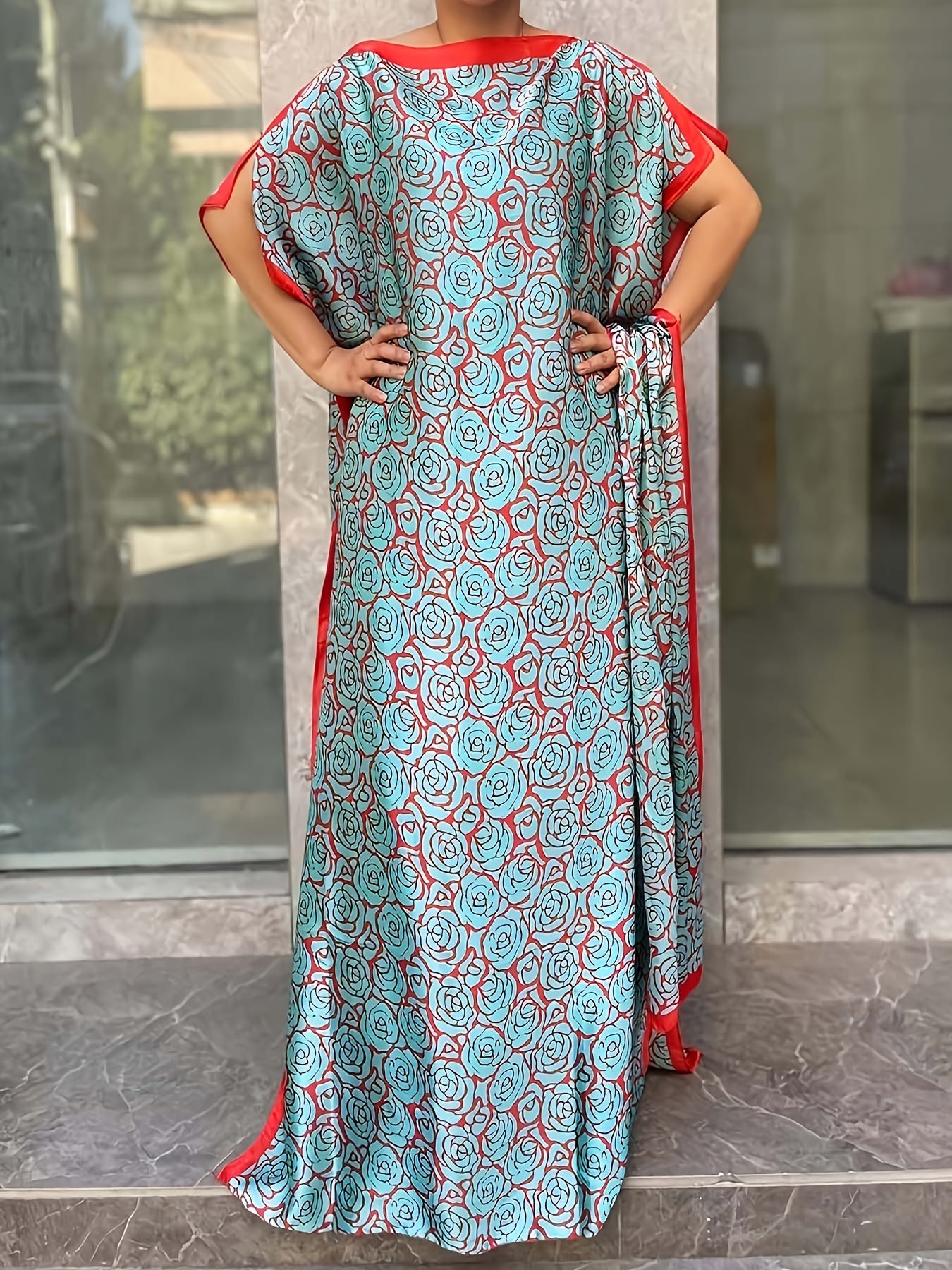 Women Plus Size Floral Print Tunic Dress With Scarf Short Sleeve Long Summer Polyester