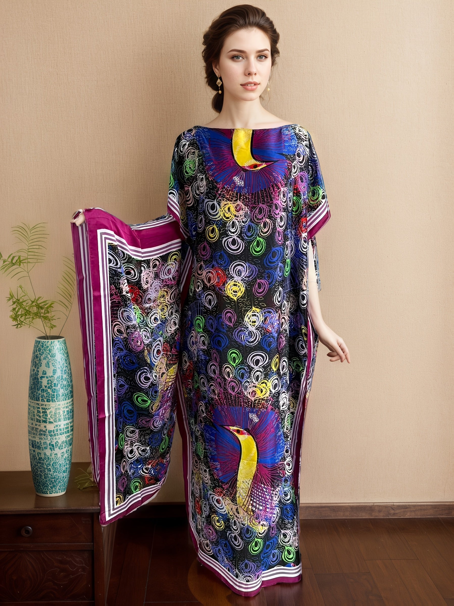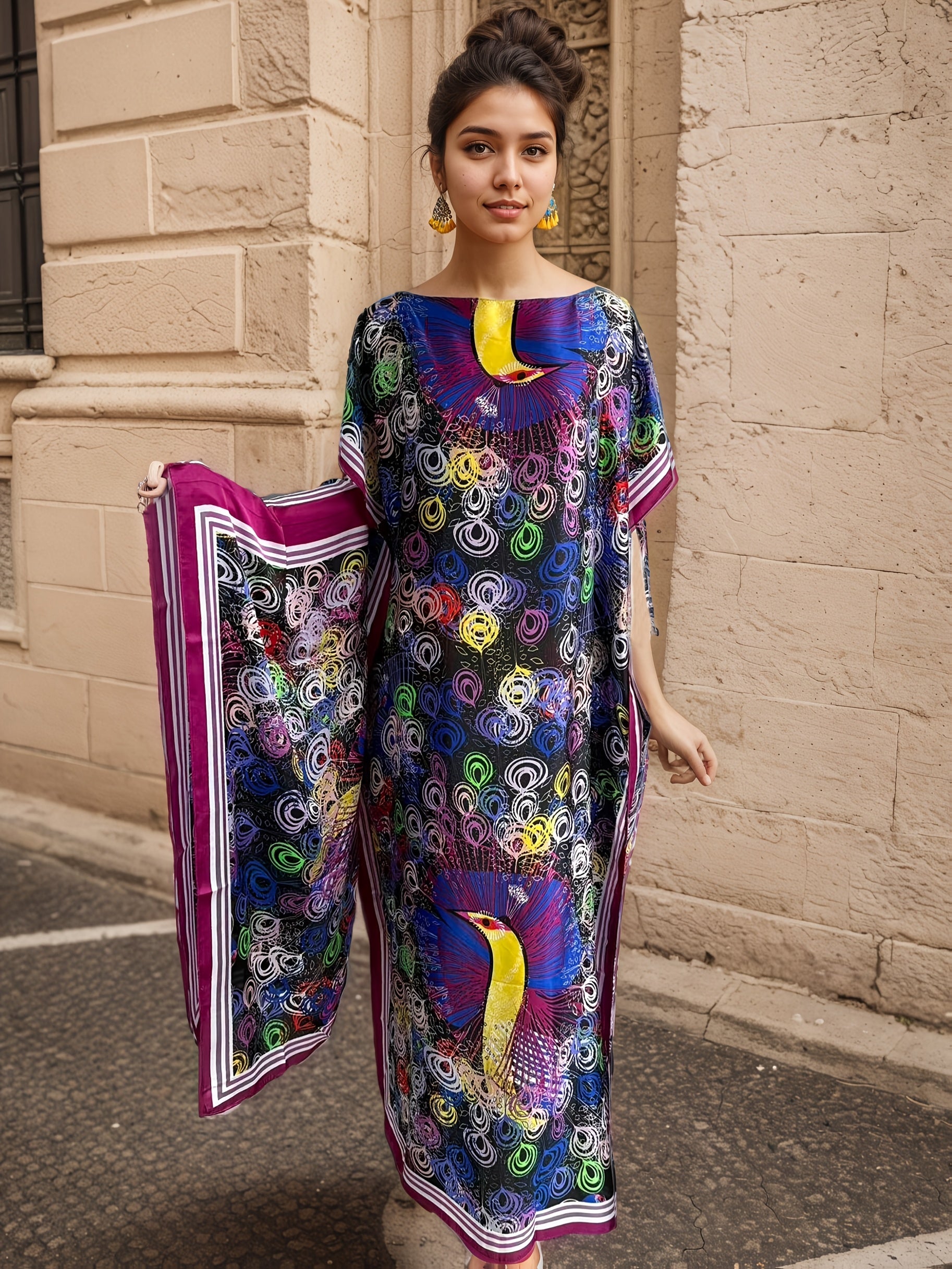 Women Plus Size Long Tunic Dress with Shawl Purple Geometric Print