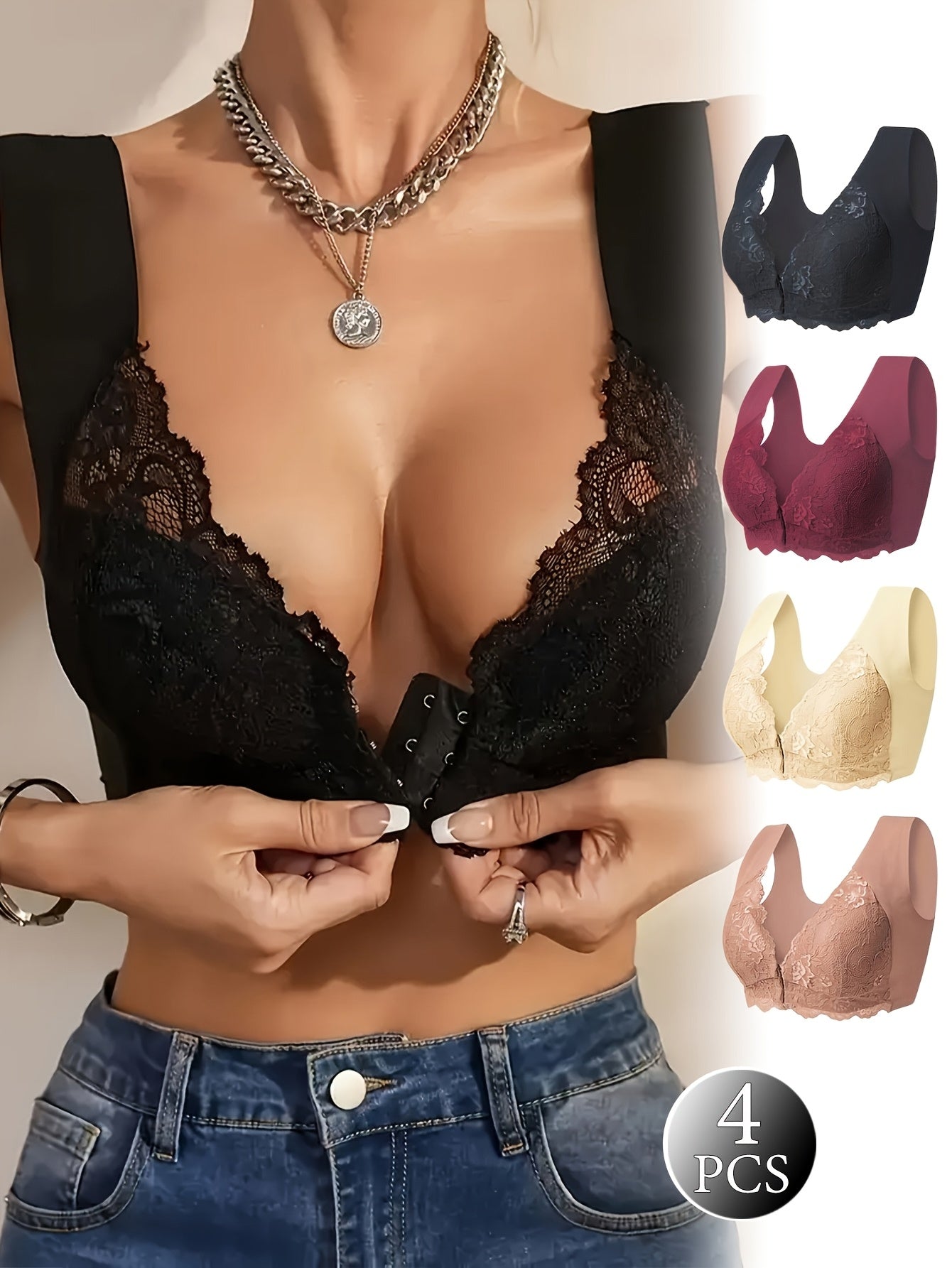 Women Plus Size Sports Bras Set Non-Wire Front Closure Removable Pads Black Beige Light Blue Pink