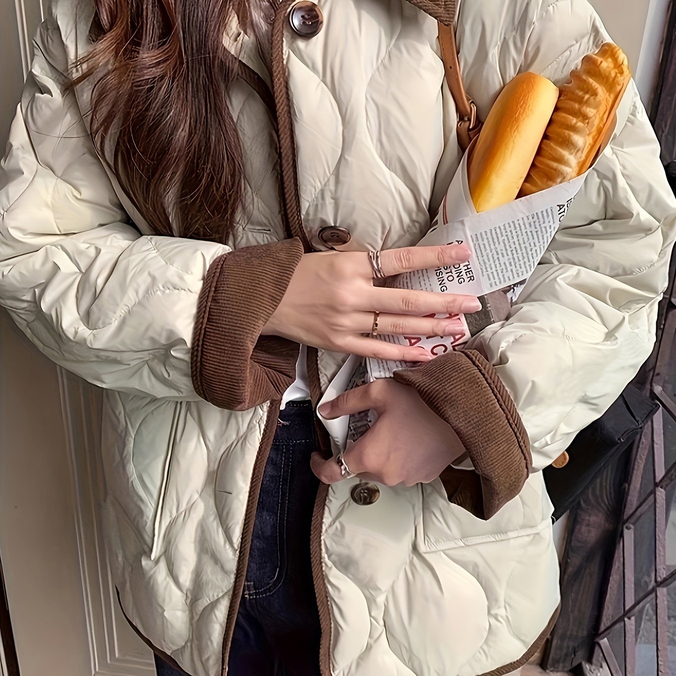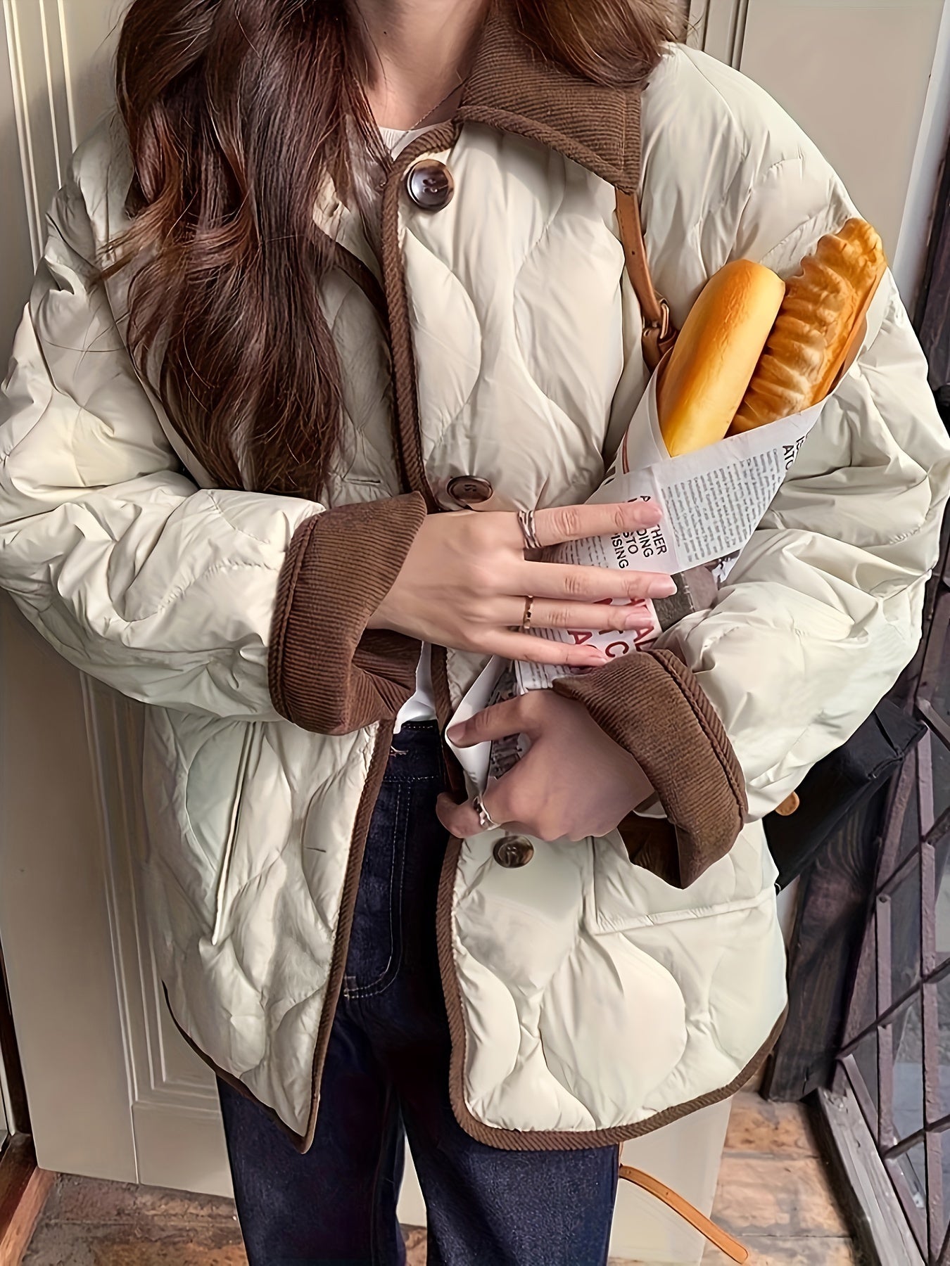 Women's Navy Blue Quilted Jacket with Faux Fur Trim Long Sleeve Winter Outerwear